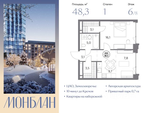 В элитном жилом комплексе "Монблан" на Шлюзовой набережной в Замоскворечье напрямую от девелопера ГК "Галс-Девелопмент" представлена 1-комнатная квартира квартира на 3 этаже общей площадью 50.20 м². Квартира предлагается без отделки. "Монблан" - элитный жилой комплекс в сердце Замоскворечья, в уникальном месте Москвы. Проект расположен в хорошо знакомом месте, напротив Дома музыки, прямо у воды. Поездка от жилого комплекса до Кремля займёт 10 минут по живописным историческим набережным города. Неординарные архитектурные формы, разработанные бюро "СПИЧ", манят взгляды к этому уникальному дому. Внутренний мир "Монблан" является продолжением его внешнего облика: - Авторская отделка лобби высококачественными материалами; - Панорамные окна, высокие потолки, квартиры с видовыми террасами и вариативность планировочных решений; - Уникальные жилые форматы с особой эстетикой: квартиры с личными террасами площадью около 60 м² и пентхаусы площадью до 228 м². На территории жилого комплекса "Монблан" предусмотрена наземная гостевая парковка. В подземной части организован двухуровневый паркинг с зарядными станциями для электрокаров. Жить у реки большое удовольствие. Ветер очищает воздух, лучи отражаются от речной глади, рядом с водой совершенно особый свет, что, конечно, увидят будущие резиденты "Монблан" в своих интерьерах.