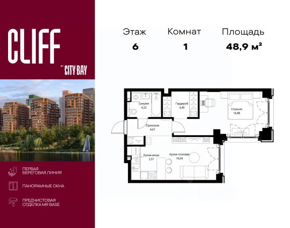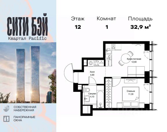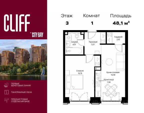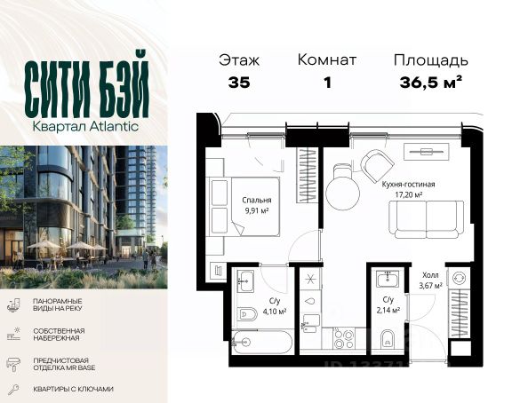 Прямая продажа от застройщика. Продаётся 1-комнатная квартира общей площадью 40.98 м² с предчистовой отделкой в ЖК Сити Бэй, квартале North, на 12-м этаже 27 этажного дома. Концепция жилого комплекса Сити Бэй - настоящий город в городе с отлично развитой инфраструктурой и собственной благоустроенной набережной. На территории жилого комплекса расположено пять кварталов - Atlantic, Pacific, Indian, North, Cliff. Жилой квартал Сити Бэй отличается оригинальной концепцией и выделяется среди других проектов такими характеристиками как: - Архитектура, - Виды из окон, - Природное окружение, вызывая гордость у жителей и восхищение у прохожих. Вся жизнь района Покровское-Стрешнево строится вокруг водных объектов: - Пойма реки Сходни с уникальной экосистемой, - Речка Химка и Химкинское водохранилище, - Москва-река, - Канал имени Москвы. Кругом вода, и местные с удовольствием этим пользуются. А сразу за рекой - центр водного спорта в Строгино с вейк-парком и яхт-клубами. Помимо воды, здесь очень много зелени: - Рядом Сходненский ковш памятник природы, естественный амфитеатр глубиной 40 метров; - Парк при усадьбе Братцево с фруктовым садом; - Дубовая роща "Маяк", - Алешкинский лес; - Лесопарк Покровское-Стрешнево с пляжами и бобрами. Главные транспортные артерии района: - Волоколамское шоссе, - Таганско-Краснопресненская линия метро и МЦД-2. Всего за 20 минут можно добраться до центра на машине или метро, а МЦД связывает ЖК Сити Бэй с северными, восточными и юго-восточными районами. Компания MR предлагает своим клиентам специальные условия приобретения квартир в рамках программ ипотечного кредитования от банков-партнеров.