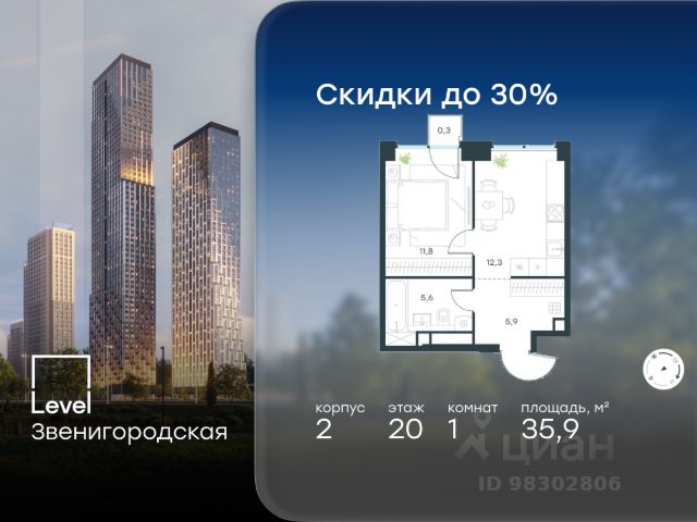 Цена указана с учётом скидки при 100%-й оплате, несубсидированной ипотеке, рассрочке (кроме программы "Рассрочка 0%"). В жилом квартале продаётся 1-комнатная квартира площадью 35.90 кв.м без отделки. Квартира расположена на 20 этаже 64 этажного корпуса 2 в жилом комплексе комфорт класса Level Звенигородская (компания Level Group/Левел групп). Отличная транспортная доступность - 5 мин. пешком до метро "Звенигородская" (откроется к окончанию строительства); - 18 мин. пешком до станции МЦК "Хорошёво" и станции БКЛ "Народное ополчение"; - 4 мин. на авто до ТТК; - 8 мин. на авто до Садового кольца; - 15 мин. на авто до Кремля. Продуманный архитектурный проект - Концепция от студии Станислава Михаловского, в основу которой легло единение природы и города; - Двухкамерные стеклопакеты в окнах, алюминиевый и ПВХ профиль - в квартирах тепло зимой и прохладно летом; - С верхних этажей откроются панорамные виды на город, Москву-реку, "Москва-Сити" и Москворецкий парк; - Лобби со всеми удобствами: окна в пол, высокие потолки до 4,7 м, лаунж-зоны, колясочные, гостевые санузлы и мойки для лап животных; - Централизованные водонагреватели гарантируют круглогодичную подачу горячей воды в каждую квартиру. Благоустройство Концепция благоустройства разработана совместно с бюро UNK landscape. Высота башен приближается к 200 метрам - они словно касаются неба. Небесный простор проецируется на территорию двора с помощью подсветки, визуально увеличивая пространство и отражаясь в авторских элементах архитектуры. На территории площадью 0,45 га расположатся: - "Облако событий" - место встреч и общения; - "Облако спорта" - всё для поддержания себя в форме; - "Облако принятия решений" - пространство для работы на свежем воздухе; - "Облако спокойствия" - для отдыха в тишине природы; - "Облако игр" - площадки для подростков и самых маленьких. Инфраструктура В жилом комплексе откроется 21 коммерческое помещение: продуктовые лавки, кафе, салоны красоты, службы доставки и творческие студии. Этап 1 включает строительство двухуровневого подземного паркинга. Всего здесь расположится 351 машино-место, включая семейные места, и 264 кладовых помещения. В распоряжении жителей развитая инфраструктура района: 15 супермаркетов, 5 спортивных объектов, 9 медучреждений, 7 детских садов, 4 школы, 3 благоустроенных парка - всё в шаговой доступности. Инженерия Комфортное перемещение внутри домов будут обеспечивать надёжные лифты с доступом в паркинг с жилых этажей. В каждом корпусе предусмотрено до шести кабин, включая сервисные лифты. Попасть на территорию комплекса можно только по единому ключу доступа. Видеонаблюдение установлено на входах в подъезды, в лобби, в общих зонах, на въезде в паркинг. Гости смогут связаться с жителями дома через входные видеопанели, а управлять доступом на территорию можно через видеодомофон или приложение на телефоне. Купить 1-комнатную квартиру с балконом в районе Хорошево-Мневники в Москве.