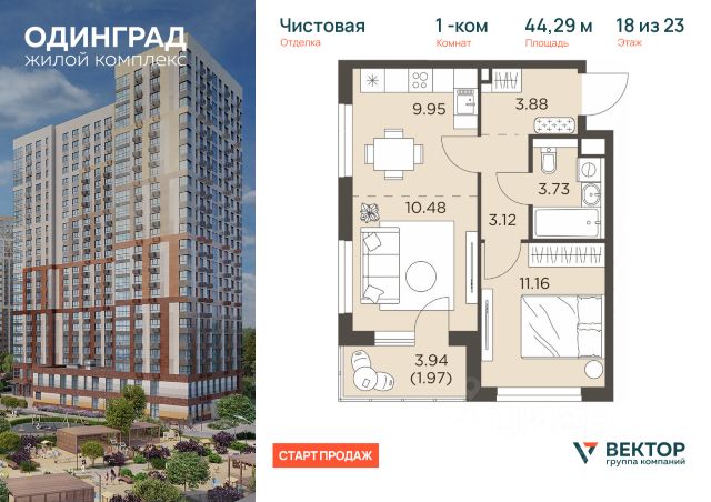 Прямая продажа от застройщика. Продается 1-комн. квартира площадью 44,29 кв.м на 5 этаже 23 этажного дома в ЖК "Одинград" от федерального девелопера ГК "Вектор". Жилой комплекс "Одинград. Квартал "Семейный"" состоит из 11 монолитных корпусов с авторской архитектурой. Панорамные лоджии позволяют любоваться рассветами и закатами, а квартиры предлагаются с чистовой отделкой, разнообразными планировками и площадью от 20 до 99 кв. м. Высота потолков варьируется от 2,7 до 3,6 м. Для семейного отдыха и активного времяпрепровождения на территории комплекса создан ландшафтный парк площадью 4,8 га. Внутренний двор "Фабрика детства" включает зоны воркаута, игровые и спортивные площадки для детей всех возрастов, гамаки, лежаки, велосипедные и беговые дорожки. Двор полностью свободен от автомобилей, а игровое оборудование рассчитано на самостоятельное использование. В квартале предусмотрена развитая инфраструктура: три детских сада и собственная школа. Для автомобилей организован наземный паркинг с круглосуточным видеонаблюдением. Природные объекты площадью 2 тыс. га находятся в шаговой доступности, здесь можно гулять, кататься на велосипеде, роликах или лыжах, проводить выходные с семьей на свежем воздухе. Комплекс удобно расположен с точки зрения транспорта. Остановка общественного транспорта находится всего в 100 м от домов, а планируемый выезд на платную скоростную трассу М-1 позволит за 15 минут добраться до Москвы и за 30 минут — до центра столицы. Архитектурный проект разработан бюро Tikkanen в финском стиле. Входные группы оборудованы зонами отдыха, предусмотрены места для колясок и спортивного инвентаря. В подъездах установлены бесшумные скоростные лифты, обеспечивающие комфорт каждому жителю.