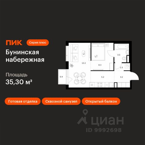 Продаётся 1-комн. квартира площадью 43,8 кв.м на 5 этаже 16 этажного дома (Корпус 2.6/1.1, Секция 1) проекта ПИК Бунинская набережная. Светлый просторный подъезд на уровне земли, функциональная планировка, большие окна, c отделкой. Удобное расположение: 18 минут пешком от м. "Потапово" и 12 минут на автомобиле до станции "Бунинская аллея". 12 минут на автомобиле до трассы Солнцево — Бутово — Варшавское шоссе. 20 минут на автомобиле до МКАД и Калужского шоссе. 1520 минут езды до живописных парков: "Бутовский лесопарк", заказник "Южное Бутово". Особенности проекта Камерный квартал в Новой Москве, на берегу Ивановского пруда. Одна из ключевых особенностей проекта — квартиры с панорамным видом на воду. Архитекторы вдохновились локацией проекта: природные оттенки и активная пластика корпусов напоминают рельефные выступы на берегу, а окна отражают водную гладь, визуально объединяя дома с природой. Преимущества проекта Светлые и просторные лобби с зонами ожидания. Подземный паркинг. Набережная и пешеходная аллея для прогулок. Парк на склоне с игровой зоной. Готовая инфраструктура района: 3 школы, 6 детских садов, взрослая и детская поликлиники. Артикул 968330 (Застройщик ООО СЗ "Стройком")