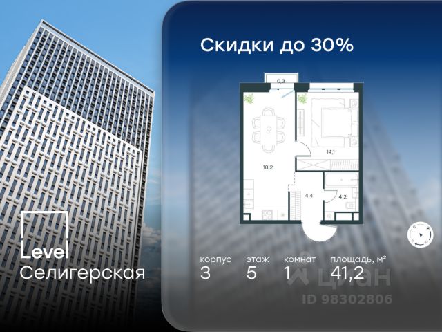 Цена указана с учётом скидки при 100%-й оплате, несубсидированной ипотеке, рассрочке (кроме программы "Рассрочка 0%"). В жилом квартале, расположенном в южной части района Западное Дегунино, продаётся 1-комнатная квартира площадью 41.20 кв.м без отделки. Квартира расположена на 5 этаже 40-этажного корпуса 3 в жилом комплексе комфорт-класса Level Селигерская (компания Level Group/Левел групп). Отличная транспортная доступность: - 10 мин. пешком до станции метро "Селигерская" от корпусов 1-й очереди; - 10 мин. пешком до станции метро "Верхние Лихоборы" от корпусов 2-й очереди; - 20 мин. пешком до станции МЦД-3 "Моссельмаш"; - 11 мин. на авто до МКАД; - 13 мин. на авто до ТТК; - 16 мин. на авто до Садового кольца. Расположение Район отличается богатой социальной инфраструктурой: школы, детские сады, поликлиники, магазины, фитнес-клубы, торговые центры - всё близко к дому. Рядом с Level Селигерская расположено 5 парковых зон. В 3 минутах от дома расположен перспективный сквер-парк. В 10 минутах пешком находится парк им. Святослава Фёдорова, в 13 минутах на велосипеде - парк "Ангарские пруды". В 7-11 минутах на автомобиле - два крупных природных объекта: Тимирязевский парк и Главный ботанический сад Российской академии наук. Благоустройство Внутренние дворы жилого комплекса огорожены от машин, а их функциональное наполнение отличается в зависимости от очереди строительства. На территории 1-й очереди будут: детская площадка, воркаут-зона, места для тихого отдыха и активных игр, а также сенсорный сад и большой луг. Во 2-й очереди жителей ждут уютные навесы с качелями, павильон-читальня, волейбольная площадка, беседки, а также детские и спортивные площадки. Технологии и инженерия Для входа на территорию комплекса предусмотрен единый ключ доступа. Все общественные зоны оснащены камерами видеонаблюдения, по заявке собственнику предоставляется возможность просмотра изображения отдельных видеокамер на его мобильном устройстве. При въезде в паркинг функционирует система распознавания госномеров. Кроме того, для комфорта жителей создано мобильное приложение, с помощью которого можно удаленно контролировать доступ на придомовую и жилую территории. Другие преимущества жилого комплекса - Высокая освещенность квартир: в большинстве из них не меньше трёх окон; - Супермаркет, магазины, кафе, пекарни и многое другое на первых этажах домов; - Частный детский сад; - Стильные дизайнерские лобби с высокими потолками до 4,9 м и окнами в пол, для питомцев предусмотрена лапомойка; - 20+ планировочных решений: от студий до семейных квартир; - С каждого этажа дома на лифте можно спуститься в подземный отапливаемый паркинг.