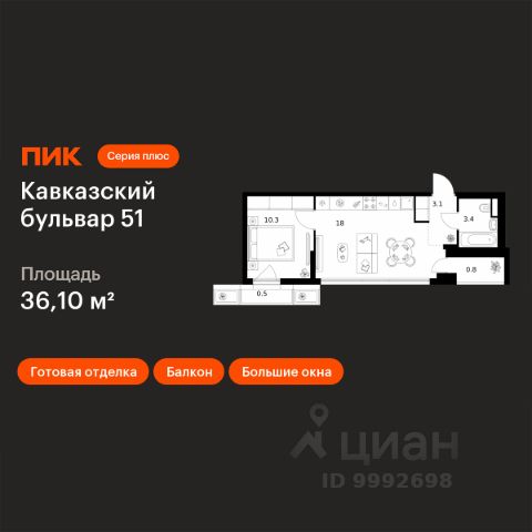 Продаётся 1-комн. квартира площадью 38,8 кв.м на 4 этаже 32 этажного дома (Корпус 3.6, Секция 3) проекта ПИК Кавказский бульвар 51. Светлый просторный подъезд на уровне земли, функциональная планировка, большие окна, c отделкой. "Кавказский бульвар 51" — современный жилой квартал в районе Царицыно. Проект частично реализован и находится в районе Царицыно, недалеко от одноимённого музея-заповедника. До метро "Кантемировская" — 17 минут пешком. За 20 можно дойти до станции "Чертаново". В 10 минутах на машине — МКАД, в 11 минутах — Варшавское шоссе, а в 16 минутах — ТТК. В проекте жилые дома высотой от 5 до 33 этажей, детский сад и школа. На первых этажах доступны магазины, кафе, салоны красоты и другие сервисы — чтобы купить кофе и свежий хлеб к завтраку, можно просто спуститься на лифте. В уютных дворах-парках есть места для отдыха и детские площадки. Для прогулок на свежем воздухе мы построим для жителей широкий пешеходный бульвар. В районе вокруг "Кавказского бульвара 51" есть всё для комфортной жизни: детские сады, школы, поликлиники, магазины и торговые центры. Девять минут на машине — и вы у музея-заповедника "Царицыно", где можно гулять среди исторических построек, лежать на траве под тенью деревьев или заниматься спортом на специальных площадках. Есть парки и поближе: до Аршиновского можно дойти за 8 минут, а до парка "Сосенки" — за 13 минут. Артикул 998813 (Застройщик АО "СПЕЦИАЛИЗИРОВАННЫЙ ЗАСТРОЙЩИК "ТОРГОВЫЙ ДОМ СПУТНИК")
