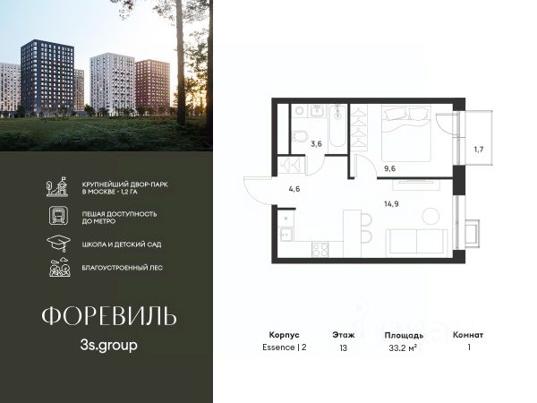 Пешая доступность от метро и московская прописка! Продается уютная 1-комн. квартира площадью 33,1 кв.м на 7 этаже 17 этажного жилого комплекса бизнес-класса Foreville от 3S Group. Общая площадь: 33,1 кв.м., жилая: 20 кв.м., площадь кухни-гостиной: 14,8 кв.м., высота потолков: 2,72 м., окна выходят на улицу. [1] Квартира предлагается без отделки, что идеально подходит для воплощения собственного дизайнерского решения. Также доступна опция предчистовой отделки, стоимость которой включается в общую цену квартиры. О проекте: Пространство Комплекс располагает крупнейшим приватным двор-парком в Новой Москве площадью 1,2 Га, предлагая жителям огромное пространство для отдыха, спорта и игр на свежем воздухе. Природный ландшафт Внутренний лесопарк с более чем 183 взрослыми деревьями и 10 320 цветущими кустарниками создает уникальную природную атмосферу для каждого времени года. Игровые и спортивные зоны Обширные площадки с безопасным покрытием, специализированные зоны для детей разных возрастных групп и взрослых, включая воркаут и настольный теннис, способствуют активному и здоровому образу жизни. Экологичность и долговечность Использование натуральных материалов, таких как лиственница, и крупноформатной бетонной плитки для покрытия, подчеркивает стремление проекта к экологичности и устойчивости. Безопасность и уединение Внутренний двор без машин обеспечивает безопасность для детей и спокойствие для взрослых. Территория огорожена и находится под круглосуточным видеонаблюдением. Сохранение времени Благодаря превосходной транспортной доступности и близости к новой станции метро Корниловская, Foreville позволяет жителям экономить время для семьи и отдыха на природе, минимизируя необходимость длительных поездок. Foreville не просто жилье, а целая экосистема для комфортной и гармоничной жизни на свежем воздухе, совмещая преимущества городской инфраструктуры и непосредственную близость к природе.