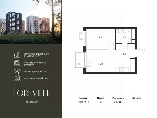 Предчистовая отделка в подарок! Пешая доступность от метро и московская прописка! Продается уютная 1-комн. квартира площадью 37,4 кв.м на 9 этаже 17 этажного жилого комплекса бизнес-класса Foreville от 3S Group. Общая площадь: 37,4 кв.м., жилая: 22,3 кв.м., площадь кухни-гостиной: 18,2 кв.м., высота потолков: 2,72 м., окна выходят на улицу. [1] Квартира предлагается без отделки, что идеально подходит для воплощения собственного дизайнерского решения. Также доступна опция предчистовой отделки, стоимость которой включается в общую цену квартиры. О проекте: Пространство Комплекс располагает крупнейшим приватным двор-парком в Новой Москве площадью 1,2 Га, предлагая жителям огромное пространство для отдыха, спорта и игр на свежем воздухе. Природный ландшафт Внутренний лесопарк с более чем 183 взрослыми деревьями и 10 320 цветущими кустарниками создает уникальную природную атмосферу для каждого времени года. Игровые и спортивные зоны Обширные площадки с безопасным покрытием, специализированные зоны для детей разных возрастных групп и взрослых, включая воркаут и настольный теннис, способствуют активному и здоровому образу жизни. Экологичность и долговечность Использование натуральных материалов, таких как лиственница, и крупноформатной бетонной плитки для покрытия, подчеркивает стремление проекта к экологичности и устойчивости. Безопасность и уединение Внутренний двор без машин обеспечивает безопасность для детей и спокойствие для взрослых. Территория огорожена и находится под круглосуточным видеонаблюдением. Сохранение времени Благодаря превосходной транспортной доступности и близости к новой станции метро Корниловская, Foreville позволяет жителям экономить время для семьи и отдыха на природе, минимизируя необходимость длительных поездок. Foreville не просто жилье, а целая экосистема для комфортной и гармоничной жизни на свежем воздухе, совмещая преимущества городской инфраструктуры и непосредственную близость к природе.