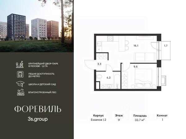 Пешая доступность от метро и московская прописка! Продается уютная 1-комн. квартира площадью 33,1 кв.м на 7 этаже 17 этажного жилого комплекса бизнес-класса Foreville от 3S Group. Общая площадь: 33,1 кв.м., жилая: 20 кв.м., площадь кухни-гостиной: 14,8 кв.м., высота потолков: 2,72 м., окна выходят на улицу. [1] Квартира предлагается без отделки, что идеально подходит для воплощения собственного дизайнерского решения. Также доступна опция предчистовой отделки, стоимость которой включается в общую цену квартиры. О проекте: Пространство Комплекс располагает крупнейшим приватным двор-парком в Новой Москве площадью 1,2 Га, предлагая жителям огромное пространство для отдыха, спорта и игр на свежем воздухе. Природный ландшафт Внутренний лесопарк с более чем 183 взрослыми деревьями и 10 320 цветущими кустарниками создает уникальную природную атмосферу для каждого времени года. Игровые и спортивные зоны Обширные площадки с безопасным покрытием, специализированные зоны для детей разных возрастных групп и взрослых, включая воркаут и настольный теннис, способствуют активному и здоровому образу жизни. Экологичность и долговечность Использование натуральных материалов, таких как лиственница, и крупноформатной бетонной плитки для покрытия, подчеркивает стремление проекта к экологичности и устойчивости. Безопасность и уединение Внутренний двор без машин обеспечивает безопасность для детей и спокойствие для взрослых. Территория огорожена и находится под круглосуточным видеонаблюдением. Сохранение времени Благодаря превосходной транспортной доступности и близости к новой станции метро Корниловская, Foreville позволяет жителям экономить время для семьи и отдыха на природе, минимизируя необходимость длительных поездок. Foreville не просто жилье, а целая экосистема для комфортной и гармоничной жизни на свежем воздухе, совмещая преимущества городской инфраструктуры и непосредственную близость к природе.