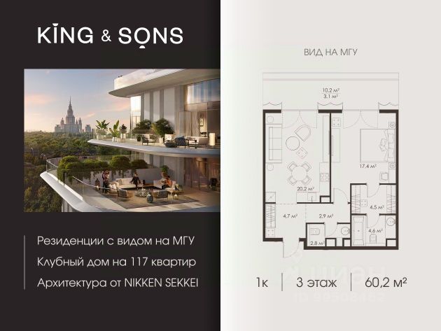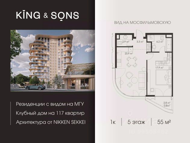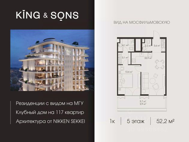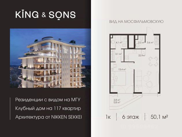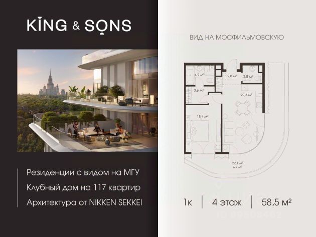 KING & SONS это клубный дом на 117 резиденций премиум-класса, расположенный на престижной и исторической улице Мосфильмовская. Из большинства квартир открываются панорамные виды на МГУ, "Москву-Сити", особняки посольств и парки. Это место для тех, кто не хочет выбирать между комфортом мегаполиса и уединением на природе. Проект разработан японским архитектурным бюро NIKKEN. Фасады из натурального камня, мягкие формы здания, максимально открытое остекление, окна в пол — все это делает облик здания выразительным и уникальным. В проекте предусмотрено 70% квартир с террасами. Потолки от 3,2 до 4,7 м. Паркинг на 110 машиномест. Для будущих резидентов продуманы разнообразные общественные пространства зимний сад в лобби первого этажа, секретный сад с зоной открытого огня, лаундж-зона с кинотеатром на крыше, собственный спортзал, зоны для занятий йогой и медитацией. KING & SONS это фамильная недвижимость, которую с гордостью передают по наследству, как искусство и бриллианты.