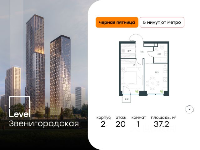 Цена указана с учётом скидки. В престижном районе Хорошёво-Мнёвники продаётся 1-комнатная квартира площадью 35.90 кв.м нет. Квартира расположена на 20 этаже 64 этажного корпуса Корпус 2 в жилом комплексе класса комфорт+ Level Звенигородская (компания Level Group/Левел групп). Отличная транспортная доступность - 5 мин. пешком до станции метро "Звенигородская" (откроется к окончанию строительства); - 18 мин. пешком до станции МЦК "Хорошёво" и станции БКЛ "Народное ополчение"; - 4 мин. на авто до ТТК; - 8 мин. на авто до Садового кольца; - 15 мин. на авто до Кремля. Продуманный архитектурный проект - Концепция от студии Станислава Михаловского, в основу которой легко единение природы и города; - Двухкамерные стеклопакеты в окнах, алюминиевый и ПВХ профиль - в квартирах тепло зимой и прохладно летом; - С верхних этажей откроются панорамные виды на город, Москву-реку, "Москва-Сити" и природно-исторический парк "Москворецкий"; - Лобби с окнами в пол и потолками до 4,7 м площадью до 79 кв. м, оснащенные всеми удобствами: стойки ресепшен, уютные лаунж-зоны, гостевые санузлы, помещения для мойки лап животных; - Централизованные водонагреватели гарантируют круглогодичную подачу горячей воды в каждую квартиру. Благоустройство Концепция благоустройства разработана совместно с бюро UNK landscape. Высота башен приближается к 200 метрам - они словно касаются неба. Небесный простор проецируется на территорию двора с помощью подсветки, визуально увеличивая пространство и отражаясь в авторских элементах архитектуры. На территории площадью 0,45 га расположатся: - "Облако событий" - место встреч и общения; - "Облако спорта" - все необходимое для поддержания себя в форме; - "Облако принятия решений" - пространство для работы на свежем воздухе; - "Облако спокойствия" - для отдыха в тишине природы; - "Облако игр" - площадки для подростков и самых маленьких. Инфраструктура На первых этажах и в стилобатной части комплекса откроется 21 коммерческое помещение: продуктовые лавки, кафе, салоны красоты, службы доставки и творческие студии. Этап 1 включает строительство двухуровневого подземного паркинга. Всего здесь расположится 351 машино-место, включая семейные места, 264 кладовых помещения для удобного хранения личных вещей. В распоряжении жителей также инфраструктура района: 15 супермаркетов, 5 спортивных объектов, 9 медучреждений, 7 детских садов, 4 школы, 3 благоустроенных парка - всё в шаговой доступности. Инженерия Комфортное перемещение внутри жилого комплекса будут обеспечивать надёжные лифты с доступом в паркинг с жилых этажей. В каждом корпусе предусмотрено 4-5 кабин, включая сервисные лифты. Попасть на территорию жилого комплекса можно только по единому ключу доступа. Видеонаблюдение установлено на входах в подъезды, в лобби, в общих зонах, на въезде в паркинг, в лифтах, детских площадках. Гости смогут связаться с жителями дома через входные видеопанели, управлять доступом на территорию можно через видеодомофон или приложение на телефоне.