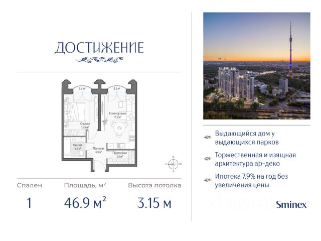 Односпальная квартира с кухней-гостиной, двумя балконами, изолированной спальней и гардеробной 3,8 кв.м. Из окон открывается потрясающий вид на Останкинскую телебашню. "Достижение" - единственный дом с торжественной архитектурой в окружении бескрайних парков на любой вкус: парк "Дубовая роща", обновленный классический парк "Останкино", самый известный парк России ВДНХ и крупнейший в Европе ботанический сад. Дом находится в непосредственной близости от центра города: до Садового кольца на автомобиле - 15 минут, 700 м до станции метро "Бутырская", а от нее всего 3 станции на метро - и вы на Цветном бульваре. Архитектура проекта - современное прочтение торжественного и изящного стиля ар-деко, который, как и сталинский ампир, сформировался в результате развития идей чикагской школы. В доме 6 секций, 115 вариантов продуманных планировочных решений - от уютных студий до просторных пентхаусов с дровяным камином. В каждой квартире предусмотрен полный комплекс систем комфорта: принудительная центральная вентиляция с фильтрацией воздуха, очистка воды до уровня питьевой, круглогодичное горячее водоснабжение, быстрые бесшумные лифты, которые идут прямо в паркинг, продуманная подготовка под кондиционирование и другие технологические решения. В доме "Достижение" общественные пространства и квартира тоже гармонично дополняют друг друга, как части единого целого. Здесь есть инфраструктурный центр Clubhouse только для жителей, открывающий возможности для общения и детского развития: клубная гостиная жителей по стандарту Friend`s Lab и детская игровая комната 250 кв.м. в концепции Kid`s Lab. На площади 1,7 гектара создан живописный парк с террасным склоном, в котором растут луговые травы, кустарники и деревья. Пространство ландшафтного парка разделено на зоны для активного и спокойного отдыха с зелёными уголками для любителей тишины. Для спокойного отдыха: тихие места с беседками и шезлонгами, клубная гостиная в концепции Friend`s Lab с открытой террасой и гамаками, зона для барбекю, смотровая галерея, уютный пруд, а также пять пеших маршрутов для променада. Для активного отдыха: универсальная многофункциональная спортивная площадка, отдельная зона для занятий workout и бесплатный фитнес-зал только для жителей по стандарту Fit Lab. В центральной части парка расположен амфитеатр со сценой для представлений и проведения мероприятий. Для гармоничного развития маленьких жителей - пространства по стандарту Kid`s Lab для гармоничного развития детей всех возрастов: детская площадка, игровая комната, рельефная площадка для общения со сверстниками, где можно заниматься паркуром, танцевать и играть в настольный теннис.