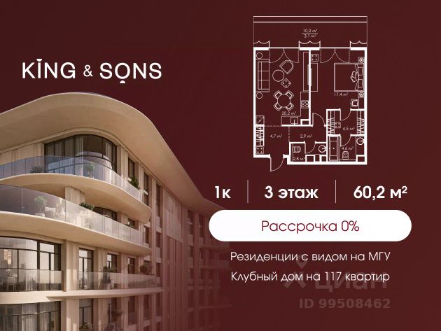 KING & SONS это клубный дом на 117 резиденций премиум-класса, расположенный на престижной и исторической улице Мосфильмовская. Из большинства квартир открываются панорамные виды на МГУ, "Москву-Сити", особняки посольств и парки. Это место для тех, кто не хочет выбирать между комфортом мегаполиса и уединением на природе. Проект разработан международным архитектурным бюро, которое входит в ТОП-2 в мире. Фасады из натурального камня, мягкие формы здания, максимально открытое остекление, окна в пол — все это делает облик здания выразительным и уникальным. В проекте предусмотрено 70% квартир с террасами. Потолки от 3,2 до 4,7 м. Паркинг на 110 машиномест. Для будущих резидентов продуманы разнообразные общественные пространства зимний сад в лобби первого этажа, секретный сад с зоной открытого огня, лаундж-зона с кинотеатром на крыше, собственный спортзал, зоны для занятий йогой и медитацией. KING & SONS это фамильная недвижимость, которую с гордостью передают по наследству Продам 1-комнатную квартиру с балконом в районе Раменки в Москве.