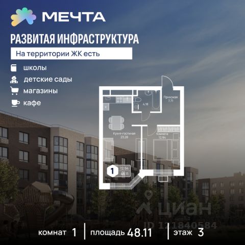 Рассрочка 0% от застройщика! Продается однокомнатная квартира в квартале "Любовь" жилого комплекса "Мечта". Общая площадь квартиры: 37.09 кв. м, этаж 2 из 5. Заселение: 2 квартал 2028 г. Отделка: Чистовая ОСОБЕННОСТИ: - Просторная спальня - Гардеробная - Балкон - Высота потолка: 2.7 метра Жилой комплекс "Мечта" расположен в 23 км от МКАД по Дмитровскому или Ленинградскому шоссе. ТРАНСПОРТНАЯ ДОСТУПНОСТЬ: - 15-20 минут на общественном транспорте до МЦД-1 "Лобня" - 30-35 минут на общественном транспорте до метро "Физтех" - 45-50 минут до станций метро "Савеловская" или "Белорусская" - 30 минут на автомобиле до Москвы Квартал "Любовь" создан для тех, кому стало тесно в рамках стандартного жилья. Здесь учтены все запросы к современному комфорту: продуманные планировки, балконы, эркеры и лифты в малоэтажных домах. Инфраструктура включает в себя муниципальную школу и детские сады, кабинет врача общей практики, множество кафе и ресторанов, а также различные спортивные и детские площадки. В пешей доступности от жилого комплекса расположены лес и три реликтовых озера — Долгое, Круглое и Нерское, а также реки Альба, Уча и Волгуша. Территория жилого комплекса закрыта для посторонних, находится под охраной и патрулируется. На въезде расположен КПП. Камеры видеонаблюдения работают круглосуточно на всей территории. Вы и ваши дети будете чувствовать себя в безопасности.