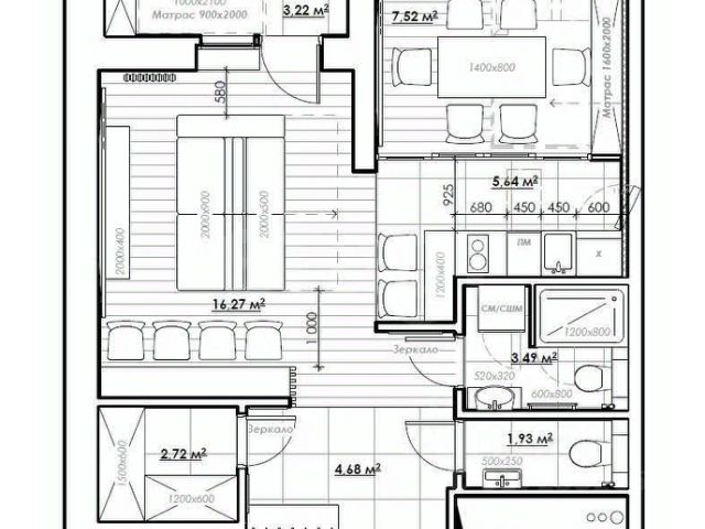 Общая площадь 38,5 м2., жилая 18 м2., кухня 8,7 м2, потолки 2,8 метра.