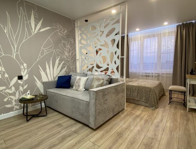 20-ти метровая комната разделена декоративной перегородкой на 2 зоны спальню и гостиную.