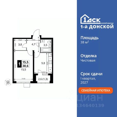 Прямая продажа от застройщика! Жилой Комплекс класса Комфорт Плюс. Продаётся 1-к квартира номер 141 общей площадью 38.6 кв.м. на 16-м этаже 24 этажного здания. Чистовая отделка. Особенности квартиры: - МЦД-5 в пешей доступности - Квартал с собственной набережной - Свои 2 детских сада и школа - Организуем показ в удобное для вас время! - Линейная планировка - максимальная функциональность и удобство. - Линейная кухня - функциональность и практичность в одном решении. - Гардеробная - удобство для хранения и организации вещей. - Лоджия - уютное место для отдыха и тишины. Квартира с чистовой отделкой. Раскройте свою индивидуальность в создании своего уникального проекта, а трудоемкий ремонт мы возьмем на себя! Вы идете в ногу со временем и предпочитаете современные, универсальные дизайнерские решения? Или вы любитель строгой лаконичной классики? Тогда наши интерьеры придутся вам по душе! Выбирайте то, что ближе лично Вам и реализуйте свои задумки вместе с нами! Информация о комплексе: ЖК "1-й Донской" в 7 км от МКАД: гармония городского комфорта и природы. Квартиры на 2-3 стороны света, форма секций и разная этажность создают динамичную архитектуру. Тёплая палитра фасадов и подсветка подчеркивают образ. Рядом - Ермолинский парк, Видновский лесопарк и Жуковский парк. Природа воздействует на все уровни восприятия: от видов до звуков и ароматов. Идеальный баланс для жизни в гармонии с окружающей средой. Транспортная доступность: Комплекс удобно расположен в 7 км от МКАД по трассе М-4 Дон (через Видное). Расстояние до Каширского шоссе составляет 12 км. Добраться до метро и центра Москвы позволяет развитая сеть маршрутов общественного наземного транспорта. Действующая ж/д станция Калинина Павелецкого направления в 15-17 минутах ходьбы (МЦД-5 в 2025-2026 гг). Внутренняя инфраструктура: "1-й Донской": продуманная среда в развивающемся районе. На территории - муниципальные школа и 2 детских сада, поликлиника, торговый центр с площадью для мероприятий. Сеть пешеходных маршрутов ведёт к магазинам и кафе, отделённым от дорог зелёными фито-стенами. Сквозные подъезды с панорамным остеклением и входами с улицы и двора наполнены светом. Всё для комфортной жизни в шаговой доступности, от повседневных нужд до общественных пространств. Квартира с чистовой отделкой: ваш стиль без ремонта. Выбирайте современный дизайн или классику - мы воплотим ваши идеи. Готовые интерьеры для уникального дома.