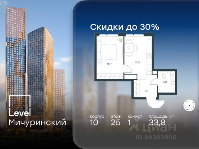 Цена указана с учётом скидки при 100%-й оплате, несубсидированной ипотеке, рассрочке (кроме программы "Рассрочка 0%"). В жилом квартале, расположенном на границе с природным заказником "Долина реки Очаковки", продаётся 1-комнатная квартира площадью 37.00 кв.м с отделкой white box. Квартира расположена на 8 этаже 24-этажного корпуса 11 в жилом комплексе бизнес-класса Level Мичуринский (компания Level Group/Левел групп). Отличная транспортная доступность: - от 10 мин. пешком до станции метро "Мичуринский проспект" - 15 мин. пешком до станции метро "Аминьевская" - 7 мин. на авто до МКАД - 10 мин. на авто до ТТК - 15 мин. на авто до Москва-Сити Продуманный архитектурный проект: - Выразительная архитектура от известных бюро: корпуса 1-6 - СПИЧ, корпуса 7-13 - Borisov Architects; - Из окон открываются живописные виды на парки, Москва-Сити и МГУ; - Высокие потолки до 6,35 м; - Стильные лобби с окнами в пол и высокими потолками до 4,7 м; - С каждого этажа дома на лифте можно спуститься в подземный отапливаемый паркинг. Расположение: Level Мичуринский строится в одном из самых зелёных районов Москвы - Очаково-Матвеевское. Этот уголок столицы идеален для поддержания здорового образа жизни. В шаговой доступности от проекта находятся заказник "Долина реки Очаковки" - 1 мин. пешком и Очаковский парк - 7 мин. пешком. На велосипеде можно добраться до таких парков, как "Событие", парк Олимпийской деревни, парк 50-летия Октября и парк Школьников. В 15 минутах езды на авто расположено более 30 детских садов (из них 14 в пешей доступности), 32 школы (из них 13 в пешей доступности) и 14 вузов. Также в ближайшем окружении - более 25 медицинских учреждений, 11 спортивных клубов и 22 продуктовых супермаркета. Внутренняя инфраструктура: На территории жилого комплекса строится три детских сада и школа. На первых этажах домов откроется супермаркет, фитнес-центр, ресторан, кафе и другие сервисы. Подземные этажи займут паркинги: трёхуровневые - в этапах 1 и 2, одноуровневый - в этапах 3 и 4. Преимущества проекта: - 4,5 га благоустроенной территории с видовым мостом, уличным кинотеатром, зонами для тихого отдыха, работы, воркаута, площадки для петанка, футбола, настольного тенниса и пляжного волейбола. - Дизайнерские лобби с панорамным видом на двор, мойками для лап животных и комфортными зонами ожидания. - Безопасность жителей: круглосуточное видеонаблюдение всех зон общего пользования (лобби, лифты, паркинги, детские площадки), система контроля доступа, управление видеодомофоном через мобильное приложение, единый ключ доступа на территорию жилого комплекса. - Технологии и комфорт: высокоскоростной Wi-Fi в лобби и на придомовой территории, автоматическая система контроля и учёта ресурсов, абонентская связь с консьержем, распознавание номеров автомобилей при въезде в паркинг и выезде из него.