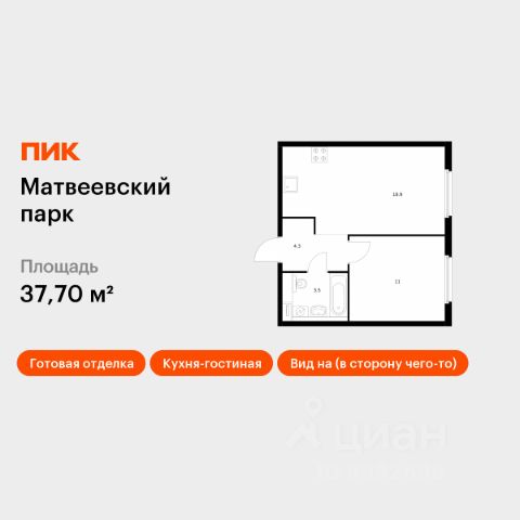 Продаётся 1-комн. квартира площадью 37,7 кв.м на 1 этаже 17 этажного дома (Корпус 1.6, Секция 8) проекта ПИК Матвеевский парк. Светлый просторный подъезд на уровне земли, функциональная планировка, большие окна, c отделкой. "Матвеевский парк" — проект "Серии плюс", расположенный на западе Москвы, в районе Очаково-Матвеевское. Ближайшая станция метро "Аминьевская" находится всего в 3 минутах пешком, а в 20 минутах — МЦД-4 "Очаково". Проект входит в состав Матвеевского кластера — современного района, где есть всё необходимое для комфортной жизни: социальная инфраструктура, парки и общественные пространства. Проект расположен в Матвеевском кластере — новом современном районе, который будет состоять из четырёх кварталов: "Матвеевский парк", "Новое Очаково", "Большая Очаковская 2" и Vangarden. Перемещаться между кварталами будет удобно по 350-метровому пешеходному мосту, под которым появится уютный зелёный парк. У проектов будет общая инфраструктура и благоустроенная территория. Уже открыта часть пешеходного бульвара, который строится по проекту британского бюро Gillespies. Здесь можно гулять после работы, играть с детьми, заниматься спортом и отдыхать у сухого фонтана с ночной подсветкой. В будущем в кластере появится пешеходный мост, который соединит жилые кварталы, и комьюнити-центр "ОМА" с магазинами, кафе, местами для спорта, встреч и общения. Отдыхать и заряжаться адреналином жители кластера смогут в SportHub Extreme — зоне площадью более 3 500 м², рассчитанной на любителей экстремальных видов спорта. Здесь будут площадки для безопасного катания на скейтбордах, роликах, самокатах и велосипедах. Для командных игр — например, мини-футбола и стритбола — появится отдельная универсальная площадка с покрытием из резины. Помимо этого, на территории "Матвеевского кластера" начнут работу пять новых школ, шесть детских садов, поликлиника и многофункциональный спортивный комплекс. Архитектурную концепцию корпусов 4 квартала разработало российское бюро KATARSIS. Акцентные белые корпуса с большими окнами делают архитектуру проекта мощной и запоминающейся. А фоновые части зданий придают образу размеренность и спокойствие. В лобби "Матвеевского парка" будет удобная зона ожидания, где можно встретить друзей, курьера или дождаться такси, а также гостевая туалетная комната и колясочная. Артикул 746961 (Застройщик ООО "СПЕЦИАЛИЗИРОВАННЫЙ ЗАСТРОЙЩИК "ЦЕНТРПОЛИС")