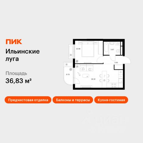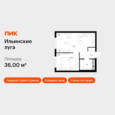 . • Предлагается однокомнатная квартира в жилом комплексе Ильинские Луга. Здесь всё про Вас и Ваши мечты! • Свободная продажа, 1 собственник, основание ДДУ (срок сдачи до 30.09.2027 года). • Квартира сдаётся с отделкой на условиях, прописанных в приложении к ДДУ. Окнами во двор. • Общая площадь квартиры 34,4 м², жилая 10,1 м², кухня 16,8 м², санузел совмещённый, окнами во двор, балкон, на 7-ом этаже. • Квартира сдаётся с отделкой на условиях, прописанных в приложении к ДДУ. • Жилой район Ильинские луга находится в 10 километрах от МКАД по Новорижскому шоссе, в 20 минутах на автомобиле от станций метро Волоколамская, Тушинская и Строгино. В будущем ближе к проекту, в 9 минутах на машине, откроется станция Ильинская. • Входы в подъезды расположены на уровне земли, широкий и зелёный пешеходный бульвар, три детских сада и школа. Дома здесь средней высоты, девятиэтажные, поэтому в квартирах и во дворах много солнечного света. • Гулять, отдыхать, играть и заниматься спортом в Ильинских лугах можно рядом с домом, купить продукты или позавтракать — так же: на первых этажах домов откроются магазины и кафе. Рядом с Ильинскими лугами три парка: за 1015 минут можно доехать до музея-усадьбы Архангельское, заповедника Лохин остров и Москвы-реки.