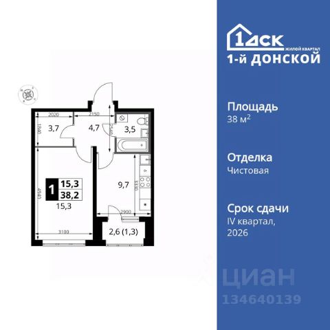 Квартира общей площадью 40.4 кв. м, с лоджией - 44,6 кв.м, потолки высотой 2,8 м.