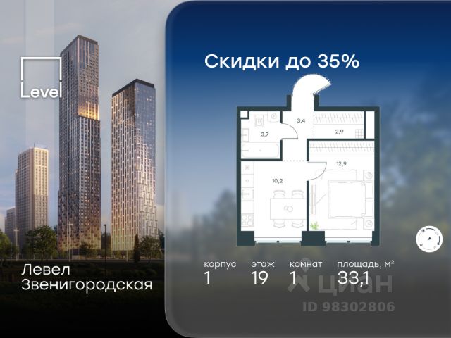 Цена указана с учётом скидки при 100%-й оплате, несубсидированной ипотеке, рассрочке (кроме программы "Рассрочка 0%"). В жилом квартале продаётся 1-комнатная квартира площадью 35.60 кв.м white box. Квартира расположена на 9 этаже 48 этажного корпуса 1 в жилом комплексе комфорт класса Левел Звенигородская (компания Level Group/Левел групп). Отличная транспортная доступность - 5 мин. пешком до метро "Звенигородская" (откроется к окончанию строительства); - 18 мин. пешком до станции МЦК "Хорошёво" и станции БКЛ "Народное ополчение"; - 4 мин. на авто до ТТК; - 8 мин. на авто до Садового кольца; - 15 мин. на авто до Кремля. Продуманный архитектурный проект - Концепция от студии Станислава Михаловского, в основу которой легло единение природы и города; - Двухкамерные стеклопакеты в окнах, алюминиевый и ПВХ профиль - в квартирах тепло зимой и прохладно летом; - С верхних этажей откроются панорамные виды на город, Москву-реку, "Москва-Сити" и Москворецкий парк; - Лобби со всеми удобствами: окна в пол, высокие потолки до 4,7 м, лаунж-зоны, колясочные, гостевые санузлы и мойки для лап животных; - Централизованные водонагреватели гарантируют круглогодичную подачу горячей воды в каждую квартиру. Благоустройство Концепция благоустройства разработана совместно с бюро UNK landscape. Высота башен приближается к 200 метрам - они словно касаются неба. Небесный простор проецируется на территорию двора с помощью подсветки, визуально увеличивая пространство и отражаясь в авторских элементах архитектуры. На территории площадью 0,45 га расположатся: - "Облако событий" - место встреч и общения; - "Облако спорта" - всё для поддержания себя в форме; - "Облако принятия решений" - пространство для работы на свежем воздухе; - "Облако спокойствия" - для отдыха в тишине природы; - "Облако игр" - площадки для подростков и самых маленьких. Инфраструктура В жилом комплексе откроется 21 коммерческое помещение: продуктовые лавки, кафе, салоны красоты, службы доставки и творческие студии. Этап 1 включает строительство двухуровневого подземного паркинга. Всего здесь расположится 351 машино-место, включая семейные места, и 264 кладовых помещения. В распоряжении жителей развитая инфраструктура района: 15 супермаркетов, 5 спортивных объектов, 9 медучреждений, 7 детских садов, 4 школы, 3 благоустроенных парка - всё в шаговой доступности. Инженерия Комфортное перемещение внутри домов будут обеспечивать надёжные лифты с доступом в паркинг с жилых этажей. В каждом корпусе предусмотрено до шести кабин, включая сервисные лифты. Попасть на территорию комплекса можно только по единому ключу доступа. Видеонаблюдение установлено на входах в подъезды, в лобби, в общих зонах, на въезде в паркинг. Гости смогут связаться с жителями дома через входные видеопанели, а управлять доступом на территорию можно через видеодомофон или приложение на телефоне.