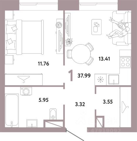 Продаётся 1-комнатная квартира в строящемся доме (ГРИН), срок сдачи: IV-кв. 2027, общей площадью 44.31 кв.м., на 14 этаже.