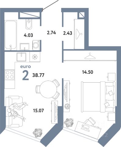 Продаётся 1-комнатная квартира в строящемся доме (ГОЛД), срок сдачи: IV-кв. 2027, общей площадью 38.77 кв.м., на 11 этаже.