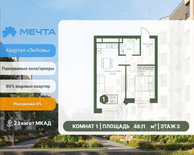Рассрочка 0% от застройщика! Продается однокомнатная квартира в квартале "Любовь" жилого комплекса "Мечта". Общая площадь квартиры: 61.09 кв. м, этаж 3 из 5. Срок сдачи: 4 квартал 2027 г. Отделка: Получистовая ОСОБЕННОСТИ: - Просторная кухня-гостиная - Большая прихожая - Высота потолка: 2.7 метра Квартал "Любовь" — это пять пятиэтажных домов, где продумано действительно всё. Здесь каждая квартира получает больше воздуха и света благодаря панорамным окнам и эркерам. А лифты в малоэтажном доме — большая редкость для Подмосковья, которая делает жизнь комфортнее с первого и до последнего этажа. Просторные мастер-спальни и продуманные планировки — визитная карточка квартала. А из 80% квартир открываются отличные виды: на зелёную зону, центральный парк, природный заказник или реликтовое озеро. В вашем дворе будет собственный детский сад, а в шаговой доступности — образовательный кампус, лес и Парк Мечты. Всё рядом, всё для жизни. Жилой комплекс "Мечта" расположен в 23 км от МКАД по Дмитровскому или Ленинградскому шоссе. ТРАНСПОРТНАЯ ДОСТУПНОСТЬ: - 15-20 минут на общественном транспорте до МЦД-1 "Лобня" - 30-35 минут на общественном транспорте до метро "Физтех" - 45-50 минут до станций метро "Савеловская" или "Белорусская" - 30 минут на автомобиле до Москвы Инфраструктура включает в себя муниципальную школу и детские сады, кабинет врача общей практики, множество кафе и ресторанов, а также различные спортивные и детские площадки. В пешей доступности от жилого комплекса расположены лес и три реликтовых озера — Долгое, Круглое и Нерское, а также реки Альба, Уча и Волгуша. Территория жилого комплекса закрыта для посторонних, находится под охраной и патрулируется. На въезде расположен КПП. Камеры видеонаблюдения работают круглосуточно на всей территории. Вы и ваши дети будете чувствовать себя в безопасности.