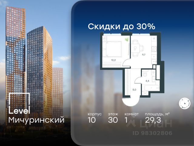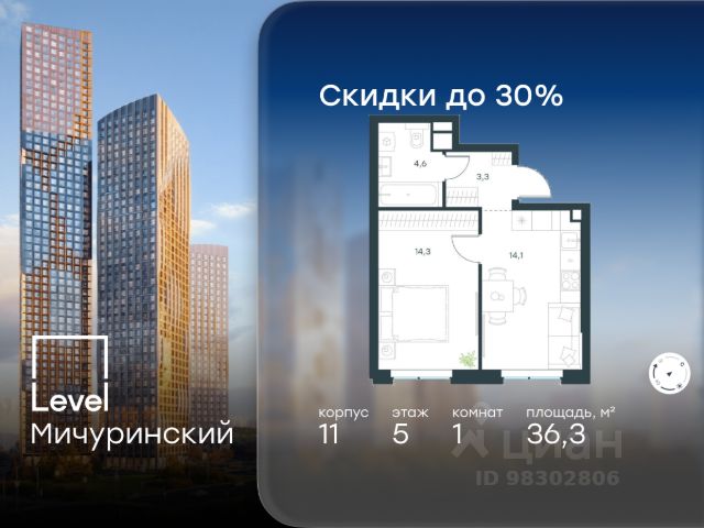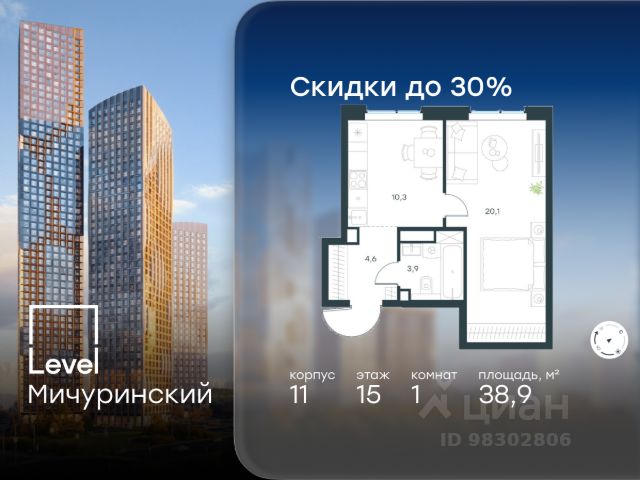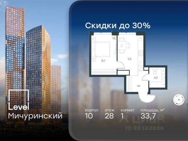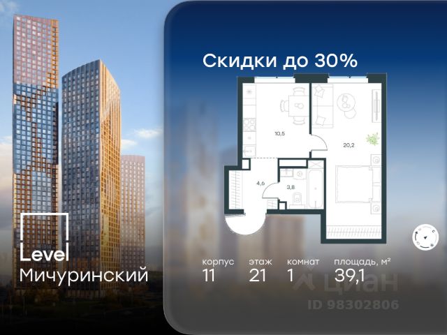 Цена указана с учётом скидки при 100%-й оплате, несубсидированной ипотеке, рассрочке (кроме программы "Рассрочка 0%"). В жилом квартале, расположенном на границе с природным заказником "Долина реки Очаковки", продаётся 1-комнатная квартира площадью 39.00 кв.м с отделкой white box. Квартира расположена на 3 этаже 24-этажного корпуса 11 в жилом комплексе бизнес-класса Level Мичуринский (компания Level Group/Левел групп). Отличная транспортная доступность: - от 10 мин. пешком до станции метро "Мичуринский проспект" - 15 мин. пешком до станции метро "Аминьевская" - 7 мин. на авто до МКАД - 10 мин. на авто до ТТК - 15 мин. на авто до Москва-Сити Продуманный архитектурный проект: - Выразительная архитектура от известных бюро: корпуса 1-6 - СПИЧ, корпуса 7-13 - Borisov Architects; - Из окон открываются живописные виды на парки, Москва-Сити и МГУ; - Высокие потолки до 6,35 м; - Стильные лобби с окнами в пол и высокими потолками до 4,7 м; - С каждого этажа дома на лифте можно спуститься в подземный отапливаемый паркинг. Расположение: Level Мичуринский строится в одном из самых зелёных районов Москвы - Очаково-Матвеевское. Этот уголок столицы идеален для поддержания здорового образа жизни. В шаговой доступности от проекта находятся заказник "Долина реки Очаковки" - 1 мин. пешком и Очаковский парк - 7 мин. пешком. На велосипеде можно добраться до таких парков, как "Событие", парк Олимпийской деревни, парк 50-летия Октября и парк Школьников. В 15 минутах езды на авто расположено более 30 детских садов (из них 14 в пешей доступности), 32 школы (из них 13 в пешей доступности) и 14 вузов. Также в ближайшем окружении - более 25 медицинских учреждений, 11 спортивных клубов и 22 продуктовых супермаркета. Внутренняя инфраструктура: На территории жилого комплекса строится три детских сада и школа. На первых этажах домов откроется супермаркет, фитнес-центр, ресторан, кафе и другие сервисы. Подземные этажи займут паркинги: трёхуровневые - в этапах 1 и 2, одноуровневый - в этапах 3 и 4. Преимущества проекта: - 4,5 га благоустроенной территории с видовым мостом, уличным кинотеатром, зонами для тихого отдыха, работы, воркаута, площадки для петанка, футбола, настольного тенниса и пляжного волейбола. - Дизайнерские лобби с панорамным видом на двор, мойками для лап животных и комфортными зонами ожидания. - Безопасность жителей: круглосуточное видеонаблюдение всех зон общего пользования (лобби, лифты, паркинги, детские площадки), система контроля доступа, управление видеодомофоном через мобильное приложение, единый ключ доступа на территорию жилого комплекса. - Технологии и комфорт: высокоскоростной Wi-Fi в лобби и на придомовой территории, автоматическая система контроля и учёта ресурсов, абонентская связь с консьержем, распознавание номеров автомобилей при въезде в паркинг и выезде из него.