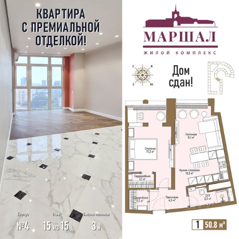 Продаётся 1-комнатная квартира в сданном доме (Маршала Рыбалко, 2К4), срок сдачи: IV-кв. 2011, общей площадью 50.48 кв.м., на 15 этаже. Готовая квартира в элитном МФК "Маршал" с премиальной отделкой "под ключ" (экологичное напольное покрытие - инженерная доска Greenline и керамогранит, высококачественные системы кондиционирования и сантехническое оборудование), выполненной европейскими специалистами по эксклюзивным дизайн-проектам, подчеркнет высокий статус владельца.