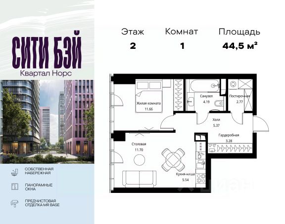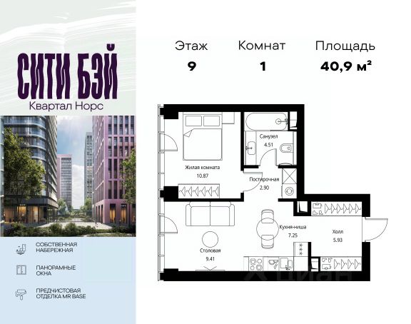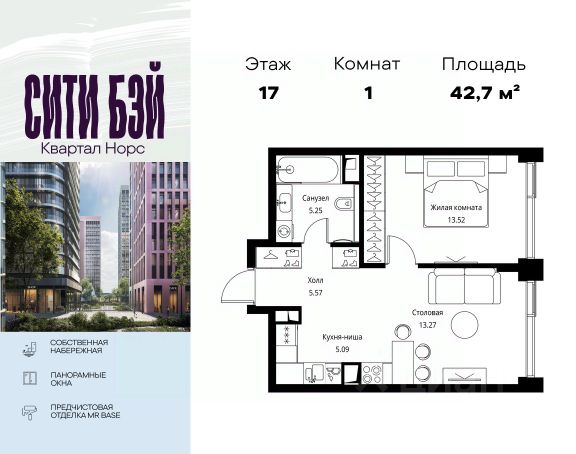 Прямая продажа от застройщика. Продаётся 1-комнатная квартира общей площадью 40.98 м² с предчистовой отделкой в ЖК Сити Бэй, квартале Норс, на 12-м этаже 27 этажного дома. Концепция жилого комплекса Сити Бэй - настоящий город в городе с отлично развитой инфраструктурой и собственной благоустроенной набережной. На территории жилого комплекса расположено пять кварталов - Атлантик, Пасифик, Индиан, Норс, Клиф. Жилой квартал Сити Бэй отличается оригинальной концепцией и выделяется среди других проектов такими характеристиками как: - Архитектура, - Виды из окон, - Природное окружение, вызывая гордость у жителей и восхищение у прохожих. Вся жизнь района Покровское-Стрешнево строится вокруг водных объектов: - Пойма реки Сходни с уникальной экосистемой, - Речка Химка и Химкинское водохранилище, - Москва-река, - Канал имени Москвы. Кругом вода, и местные с удовольствием этим пользуются. А сразу за рекой - центр водного спорта в Строгино с вейк-парком и яхт-Клубами. Помимо воды, здесь очень много зелени: - Рядом Сходненский ковш памятник природы, естественный амфитеатр глубиной 40 метров; - Парк при усадьбе Братцево с фруктовым садом; - Дубовая роща "Маяк", - Алешкинский лес; - Лесопарк Покровское-Стрешнево с пляжами и бобрами. Главные транспортные артерии района: - Волоколамское шоссе, - Таганско-Краснопресненская линия метро и МЦД-2. Всего за 20 минут можно добраться до центра на машине или метро, а МЦД связывает ЖК Сити Бэй с северными, восточными и юго-восточными районами. Компания MR предлагает своим клиентам специальные условия приобретения квартир в рамках программ ипотечного кредитования от банков-партнеров. Купить 1-комнатную квартиру с евроремонтом на шоссе Волоколамское в Москве.