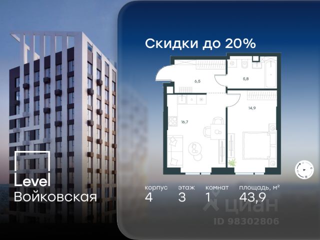 Цена указана с учётом скидки при 100%-й оплате, несубсидированной ипотеке, рассрочке (кроме программы "Рассрочка 0%"). Продается 1-комнатная квартира площадью 49.00 кв. м с отделкой. Квартира находится на 3 этаже 26-этажного корпуса 4, в новом жилом комплексе бизнес-класса Level Войковская, расположенном рядом с живописным заповедником "Покровское-Стрешнево" (застройщик - компания Level Group/Левел групп). Прекрасная транспортная доступность - 7 мин. пешком до станции МЦК "Балтийская"; - 15 мин. пешком до станции метро "Войковская"; - 8 мин. на машине до ТТК; - 15 мин. на машине до центра Москвы; - 20 мин. на машине до Москва-Сити. Продуманный архитектурный проект - стильная архитектура от мастерской Фефелова В. В.; - панорамные виды на парки, Химкинское водохранилище и Останкинскую башню; - лобби с высотой потолков до 6,45 метров; - более 20 видов планировочных решений, включая редкие форматы квартир с террасой и увеличенной высотой потолков до 5,42 метров; - 2 варианта дизайнерской отделки в корпусе 4, предлагаются как дополнительная опция к отделке white box: стиль Modern в светлых холодных тонах и стиль Classic в нейтральной бежевой гамме. Квартиры в корпусах 3 и 5 сдаются без отделки. Расположение Level Войковская строится в престижном Северном округе Москвы. Развитая инфраструктура и живописная природа переплетаются в единый ансамбль, столь значимый для комфортной жизни. Войковский район окружают парки и набережные. В шаговой доступности - парк "Покровское-Стрешнево", не более 15-ти минут на велосипеде занимает путь до Тимирязевского парка и 9-ти минут до парка усадьбы Михалково. Рядом более 60 школ, 75 дошкольных учреждений, 17 государственных и 6 частных вузов, 25 супермаркетов, 4 торговых центра, среди которых ТЦ "Метрополис" и ТЦ "Авиапарк". Внутренняя инфраструктура На территории жилого комплекса предусмотрены коммерческие помещения: кафе, ресторан, пекарня и другие сервисы откроются на первых этажах корпусов. Для жителей будет доступен отапливаемый подземный паркинг на 244 машино-места с доступом с любого этажа на лифте. На территории паркинга будет расположено 125 кладовых помещений для хранения сезонного инвентаря. Лобби и благоустройство Дизайн лобби Level Войковская создан совместно с бюро BLANK. Это уютные гостиные, где хочется задержаться. Теплая цветовая гамма, ресепшен, зоны ожидания, лапомойки и гостевые санузлы - каждая деталь превращает лобби в комфортное продолжение вашего дома. 1,15 га площади в первых двух этапах строительства отведено под приватный внутренний двор, который спроектирован совместно с бюро "Правда". Детские площадки для всех возрастов, спортивные пространства для йоги, воркаута и петанка, уютные зоны для тихого отдыха или работы. Здесь утро начинается с вдохновения, а вечер наполнен приятными моментами. Лифты Комфортное перемещение внутри жилого комплекса будут обеспечивать надёжные лифты с доступом в паркинг с жилых этажей. В каждом корпусе предусмотрено по 3 грузопассажирских лифта. 1-комнатной квартиры с евроремонтом в районе Войковский в Москве.