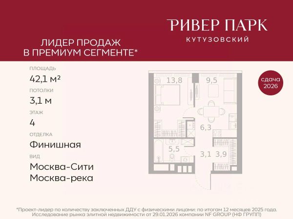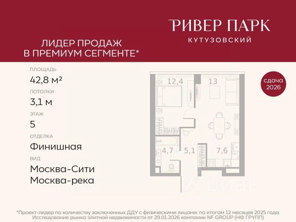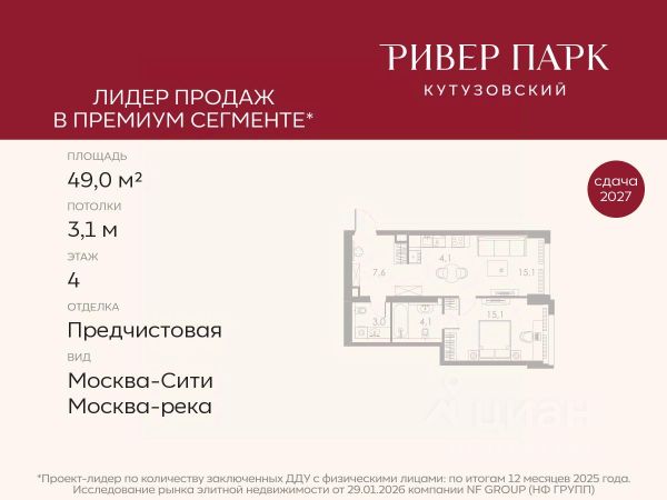 Продается 1-к квартира площадью 48.4 кв.м. на 26-м этаже в жилом комплексе премиум-класса Ривер Парк Кутузовский в Башне Изумруд Премиальный жилой комплекс Ривер Парк Кутузовский строится в одном из самых престижных районов столицы Дорогомилово, на берегу Москвы-реки с лучшими видами на Москва-Сити. Яркий проект в стиле эко-футуризма станет самым масштабным и самым высотным ЖК в локации Кутузовского проспекта. Расположение и Транспортная доступность: • На берегу Москвы-реки, напротив Москва-Сити • 600 метров до Кутузовского проспекта • Удобный съезд с ТТК • Прямой выезд на МКАД по Проспекту Багратиона. • В пешей доступности 3 станции метро: Фили, Парк Победы, Кутузовская, а также станция МЦД Фили. Архитектура от именитого бюро ADM отличается уникальной пластикой фасадов - башни словно парят в воздухе, играя гранями как драгоценные камни. Жилой комплекс состоит из 5-ти небоскребов с приватным парком 2 Га и внешней торговой галереей с открытым доступом. В закрытом внутреннем дворе уникальная по насыщенности клубная инфраструктура только для жителей: • Площадка Мультиспорт (баскетбол, футбол, воллейбол, большой теннис) • Детский игровой клуб Немо • Музыкальная студия • Клуб Гедонист с бильярдной • Студия стиля для стилистов и массажа • Гольф-симулятор • Караоке Впервые в Москве лаунж-зоны на крыше небоскребов, только для жителей: • Всесезонные беседки иглу • Джакузи • Гриль • Площадка для занятий йогой • Самые высоки качели на крыше в России • Видовые площадки Благоустройство комплекса занимает 3 гектара и разработано мировым экспертом по городским парковым ландшафтам - голландским бюро WEST8. Концепция проекта дать жителям отдохнуть от городского ритма и расслабиться среди природы. В Приватном парке уже высажены хвойные деревья-крупномеры сосны и ели. • Зеркальный пруд с арт-объектом • Две детские площадки • Точка спорта с тренажерами и турниками • Цветущий сад • Зеленый театр со сценой и проектором • Видовая зона отдыха с очагом • Солнечная терраса с лежаками На территории жилого комплекса планируется строительство коммерческого образовательного центра, включающего детский сад на 200 мест и школу на 460 мест.