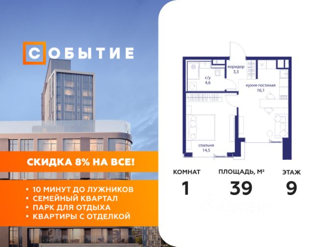 8 дней до окончания акции "Скидка 8%" Весь март - скидка до 8% действует до 31.03.2026 г. при 100% оплате и не субсидированной ипотеке! В продаже 1-к квартира от застройщика. Общая площадь 39.00, жилая 14.50, кухня 16.6. Квартира расположена на 9 этаже жилого квартала "Событие-6", корпус 1, Секция Секция 3. Квартира с чистовой отделкой. Срок сдачи: 4 кв. 2029 года. СОБЫТИЕ.6 — финальный дом парк-квартала СОБЫТИЕ на Мосфильмовской. Переезжайте в уже сформированный квартал с готовой инфраструктурой и парком! Премиальный жилой комплекс в престижном районе Москвы предлагает стильную архитектуру, продуманное благоустройство и великолепно разнообразие общественных пространств. Свой парк прямо возле дома! Архитектура Архитектура СОБЫТИЯ.6 выполнена в ультрасовременном стиле московским бюро Atrium на основе дизайн-кода британских архитекторов LDA Design и UHA London. Дом отличает оригинальная геометрия фасадов, большое остекление и высокие лобби (до 6,2 м) с авторской мебелью и светильниками. Расположение Мосфильмовская улица (Раменки) — один из престижных районов Москвы. Близость к историческому и деловому центру, природным зонам Запада столицы. Транспортная доступность: • 10 мин до Москва-Сити и ТТК; • 15 мин до Садового кольца; • 25 мин до аэропорта Внуково; • 7-10 мин до станций метро "Аминьевская" и "Мичуринский проспект". Инфраструктура: • парк "Событие" (12 га, финалист конкурса Правительства Москвы) с беговыми (1,5 км) и велодорожками (2,7 км), экотропой (1,6 км), площадками, лекторием; • школа, детский сад, магазины, салоны красоты, рестораны (к моменту заселения); • мультидвор с игровыми и спортивными площадками, мини-бульваром; • общественная терраса на 10-м этаже (коворкинг, лаунж); • Закрытые общественные пространства: детская комната, спортивный зал, коворкинг, лаунж-зоны. Паркинг 256 мест для жителей (48 — для электромобилей), 24 гостевых (5 — для электромобилей), мойки колес, кладовые, зоны для велосипедов. Окружение Парки и заповедники (Воробьёвы горы, Матвеевский лес и др.), МГУ, театр им. Н. И. Сац, стадион "Лужники". Безопасность Видеонаблюдение, контроль доступа, видеодомофоны, консьерж-сервис 24/7, системы пожарной безопасности и мультисервисная оптическая сеть.