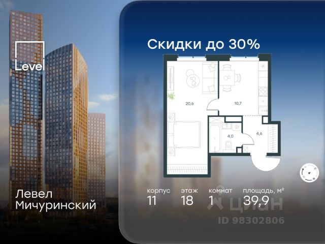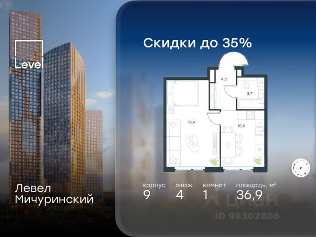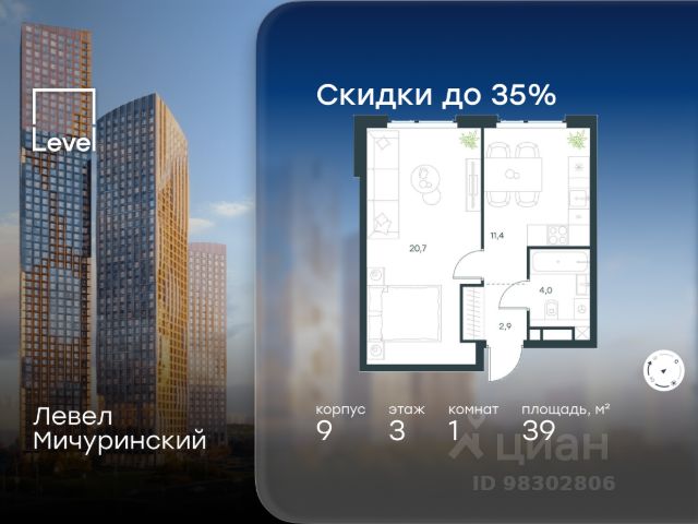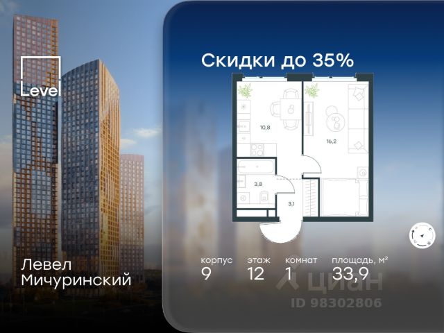 Цена указана с учётом скидки при 100%-й оплате, несубсидированной ипотеке, рассрочке (кроме программы "Рассрочка 0%"). В жилом квартале, расположенном на границе с природным заказником "Долина реки Очаковки", продаётся 1-комнатная квартира площадью 33.50 кв.м без отделки. Квартира расположена на 20 этаже 48-этажного корпуса 8 в жилом комплексе бизнес-класса Левел Мичуринский (компания Level Group/Левел групп). Отличная транспортная доступность: - от 10 мин. пешком до станции метро "Мичуринский проспект" - 15 мин. пешком до станции метро "Аминьевская" - 7 мин. на авто до МКАД - 10 мин. на авто до ТТК - 15 мин. на авто до Москва-Сити Продуманный архитектурный проект: - Выразительная архитектура от известных бюро: корпуса 1-6 - СПИЧ, корпуса 7-13 - Borisov Architects; - Из окон открываются живописные виды на парки, Москва-Сити и МГУ; - Высокие потолки до 6,35 м; - Стильные лобби с окнами в пол и высокими потолками до 4,7 м; - С каждого этажа дома на лифте можно спуститься в подземный отапливаемый паркинг. Расположение: Жилой комплекс Левел Мичуринский строится в одном из самых зелёных районов Москвы - Очаково-Матвеевское. Этот уголок столицы идеален для поддержания здорового образа жизни. В шаговой доступности от проекта находятся заказник "Долина реки Очаковки" - 1 мин. пешком и Очаковский парк - 7 мин. пешком. На велосипеде можно добраться до таких парков, как "Событие", парк Олимпийской деревни, парк 50-летия Октября и парк Школьников. В 15 минутах езды на авто расположено более 30 детских садов (из них 14 в пешей доступности), 32 школы (из них 13 в пешей доступности) и 14 вузов. Также в ближайшем окружении - более 25 медицинских учреждений, 11 спортивных клубов и 22 продуктовых супермаркета. Внутренняя инфраструктура: На территории жилого комплекса строится три детских сада и школа. На первых этажах домов откроется супермаркет, фитнес-центр, ресторан, кафе и другие сервисы. Подземные этажи займут паркинги: трёхуровневые - в этапах 1 и 2, одноуровневый - в этапах 3 и 4. Преимущества проекта: - 4,5 га благоустроенной территории с видовым мостом, уличным кинотеатром, зонами для тихого отдыха, работы, воркаута, площадки для петанка, футбола, настольного тенниса и пляжного волейбола. - Дизайнерские лобби с панорамным видом на двор, мойками для лап животных и комфортными зонами ожидания. - Безопасность жителей: круглосуточное видеонаблюдение всех зон общего пользования (лобби, лифты, паркинги, детские площадки), система контроля доступа, управление видеодомофоном через мобильное приложение, единый ключ доступа на территорию жилого комплекса. - Технологии и комфорт: высокоскоростной Wi-Fi в лобби и на придомовой территории, автоматическая система контроля и учёта ресурсов, абонентская связь с консьержем, распознавание номеров автомобилей при въезде в паркинг и выезде из него.