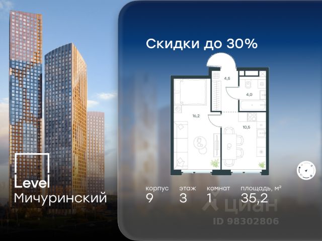 Цена указана с учётом скидки при 100%-й оплате, несубсидированной ипотеке, рассрочке (кроме программы "Рассрочка 0%"). В жилом квартале, расположенном на границе с природным заказником "Долина реки Очаковки", продаётся 1-комнатная квартира площадью 40.70 кв.м без отделки. Квартира расположена на 2 этаже 48-этажного корпуса 8 в жилом комплексе бизнес-класса Level Мичуринский (компания Level Group/Левел групп). Отличная транспортная доступность: - от 10 мин. пешком до станции метро "Мичуринский проспект" - 15 мин. пешком до станции метро "Аминьевская" - 7 мин. на авто до МКАД - 10 мин. на авто до ТТК - 15 мин. на авто до Москва-Сити Продуманный архитектурный проект: - Выразительная архитектура от известных бюро: корпуса 1-6 - СПИЧ, корпуса 7-13 - Borisov Architects; - Из окон открываются живописные виды на парки, Москва-Сити и МГУ; - Высокие потолки до 6,35 м; - Стильные лобби с окнами в пол и высокими потолками до 4,7 м; - С каждого этажа дома на лифте можно спуститься в подземный отапливаемый паркинг. Расположение: Level Мичуринский строится в одном из самых зелёных районов Москвы - Очаково-Матвеевское. Этот уголок столицы идеален для поддержания здорового образа жизни. В шаговой доступности от проекта находятся заказник "Долина реки Очаковки" - 1 мин. пешком и Очаковский парк - 7 мин. пешком. На велосипеде можно добраться до таких парков, как "Событие", парк Олимпийской деревни, парк 50-летия Октября и парк Школьников. В 15 минутах езды на авто расположено более 30 детских садов (из них 14 в пешей доступности), 32 школы (из них 13 в пешей доступности) и 14 вузов. Также в ближайшем окружении - более 25 медицинских учреждений, 11 спортивных клубов и 22 продуктовых супермаркета. Внутренняя инфраструктура: На территории жилого комплекса строится три детских сада и школа. На первых этажах домов откроется супермаркет, фитнес-центр, ресторан, кафе и другие сервисы. Подземные этажи займут паркинги: трёхуровневые - в этапах 1 и 2, одноуровневый - в этапах 3 и 4. Преимущества проекта: - 4,5 га благоустроенной территории с видовым мостом, уличным кинотеатром, зонами для тихого отдыха, работы, воркаута, площадки для петанка, футбола, настольного тенниса и пляжного волейбола. - Дизайнерские лобби с панорамным видом на двор, мойками для лап животных и комфортными зонами ожидания. - Безопасность жителей: круглосуточное видеонаблюдение всех зон общего пользования (лобби, лифты, паркинги, детские площадки), система контроля доступа, управление видеодомофоном через мобильное приложение, единый ключ доступа на территорию жилого комплекса. - Технологии и комфорт: высокоскоростной Wi-Fi в лобби и на придомовой территории, автоматическая система контроля и учёта ресурсов, абонентская связь с консьержем, распознавание номеров автомобилей при въезде в паркинг и выезде из него.