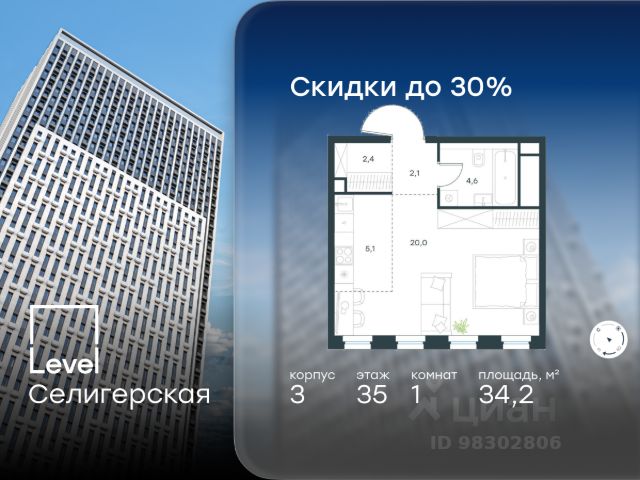 Цена указана с учётом скидки при 100%-й оплате, несубсидированной ипотеке, рассрочке (кроме программы "Рассрочка 0%"). В жилом квартале, расположенном в южной части района Западное Дегунино, продаётся 1-комнатная квартира площадью 40.60 кв.м без отделки. Квартира расположена на 34 этаже 40-этажного корпуса 3 в жилом комплексе комфорт-класса Level Селигерская (компания Level Group/Левел групп). Отличная транспортная доступность: - 10 мин. пешком до станции метро "Селигерская" от корпусов 1-й очереди; - 10 мин. пешком до станции метро "Верхние Лихоборы" от корпусов 2-й очереди; - 20 мин. пешком до станции МЦД-3 "Моссельмаш"; - 11 мин. на авто до МКАД; - 13 мин. на авто до ТТК; - 16 мин. на авто до Садового кольца. Расположение Район отличается богатой социальной инфраструктурой: школы, детские сады, поликлиники, магазины, фитнес-клубы, торговые центры - всё близко к дому. Рядом с Level Селигерская расположено 5 парковых зон. В 3 минутах от дома расположен перспективный сквер-парк. В 10 минутах пешком находится парк им. Святослава Фёдорова, в 13 минутах на велосипеде - парк "Ангарские пруды". В 7-11 минутах на автомобиле - два крупных природных объекта: Тимирязевский парк и Главный ботанический сад Российской академии наук. Благоустройство Внутренние дворы жилого комплекса огорожены от машин, а их функциональное наполнение отличается в зависимости от очереди строительства. На территории 1-й очереди будут: детская площадка, воркаут-зона, места для тихого отдыха и активных игр, а также сенсорный сад и большой луг. Во 2-й очереди жителей ждут уютные навесы с качелями, павильон-читальня, волейбольная площадка, беседки, а также детские и спортивные площадки. Технологии и инженерия Для входа на территорию комплекса предусмотрен единый ключ доступа. Все общественные зоны оснащены камерами видеонаблюдения, по заявке собственнику предоставляется возможность просмотра изображения отдельных видеокамер на его мобильном устройстве. При въезде в паркинг функционирует система распознавания госномеров. Кроме того, для комфорта жителей создано мобильное приложение, с помощью которого можно удаленно контролировать доступ на придомовую и жилую территории. Другие преимущества жилого комплекса - Высокая освещенность квартир: в большинстве из них не меньше трёх окон; - Супермаркет, магазины, кафе, пекарни и многое другое на первых этажах домов; - Частный детский сад; - Стильные дизайнерские лобби с высокими потолками до 4,9 м и окнами в пол, для питомцев предусмотрена лапомойка; - 20+ планировочных решений: от студий до семейных квартир; - С каждого этажа дома на лифте можно спуститься в подземный отапливаемый паркинг.
