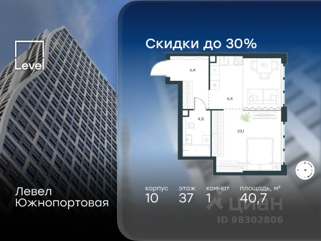 Цена указана с учётом скидки при 100%-й оплате, несубсидированной ипотеке, рассрочке (кроме программы "Рассрочка 0%"). В северной части района Печатники продается 1-комнатная квартира площадью 33.70 кв.м без отделки. Квартира расположена на 48 этаже 68-этажного корпуса 3 в жилом комплексе комфорт-класса Левел Южнопортовая (компания Level Group/Левел групп). Отличная транспортная доступность: - 10 мин. пешком до станции метро "Кожуховская"; - 20 мин. пешком до станции МЦК "Дубровка"; - 3 мин. на авто до ТТК; - 13 мин. на авто до Садового кольца; - 15 мин. на авто до Бульварного кольца. Продуманный архитектурный проект: - авторская архитектура от бюро СПИЧ; - уникальные виды на реку, парки и достопримечательности города; - высота потолков в квартирах до 6 м; - окна высотой до 1,87 м с высоким коэффициентом сопротивления теплоотдаче. Расположение: Левел Южнопортовая строится в северной части района Печатники - самой приближенной к центру. Здесь будет сформирован новый район "Южный порт", где построят крупный жилой и общественно-деловой центр, аналогичный Москва-Сити. В течение 10-12 лет в этом месте появятся не только жилые дома, но и развитая инфраструктура для жизни и работы. А еще совсем рядом находится набережная Москвы-реки, где планируется построить причалы для речных трамвайчиков и канатную дорогу. Уже сейчас вокруг жилого комплекса работают десятки магазинов и торговых центров, рядом расположено 6 парков, среди которых музей-заповедник "Коломенское". В 10 минутах пешком - 2 муниципальных и 2 частных детских сада, 7 общеобразовательных школ. Внутренняя инфраструктура: Для отдыха жителей в каждом корпусе предусмотрено лобби, оснащенное местами для отдыха, гостевыми санузлами и лапомойками, а в отдельных корпусах - камином. За счёт больших окон и высоких потолков пространства будут наполнены воздухом и светом. На первых этажах жилого комплекса откроются магазины, салоны красоты, фитнес-центр. Для детей строятся собственные детский сад и школа. Благоустройство: Внутренний двор комплекса разработан совместно с бюро GAFA. Основная идея - создать аналог Центрального парка в Нью-Йорке, гармонично сочетая высотные здания и большое изолированное парковое пространство. Вся площадь двора-парка будет огорожена и составит более 2 га, из которых 45% - озеленение. Одним из самых важных ландшафтных элементов здесь станет небольшая речка, наполняющаяся во время дождя. Вокруг неё появится сеть из островов, внутри которых расположатся тематические зоны спорта и отдыха. Технологии и инженерия: - автоматическая передача в управляющую компанию показаний квартирных счётчиков; - телефонная связь, телевидение и интернет на базе оптической мультисервисной сети; - гостевой Wi-Fi в лобби и на территории двора; - единый ключ доступа для входа на территорию комплекса.