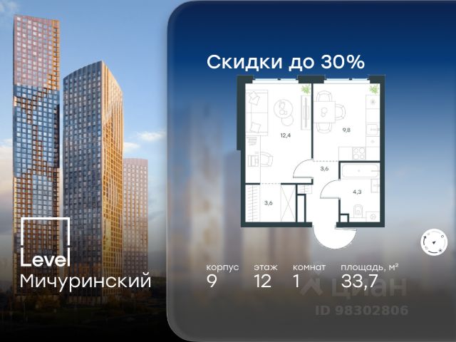 Цена указана с учётом скидки при 100%-й оплате, несубсидированной ипотеке, рассрочке (кроме программы "Рассрочка 0%"). В жилом квартале, расположенном на границе с природным заказником "Долина реки Очаковки", продаётся 1-комнатная квартира площадью 33.50 кв.м без отделки. Квартира расположена на 13 этаже 48-этажного корпуса 8 в жилом комплексе бизнес-класса Level Мичуринский (компания Level Group/Левел групп). Отличная транспортная доступность: - от 10 мин. пешком до станции метро "Мичуринский проспект" - 15 мин. пешком до станции метро "Аминьевская" - 7 мин. на авто до МКАД - 10 мин. на авто до ТТК - 15 мин. на авто до Москва-Сити Продуманный архитектурный проект: - Выразительная архитектура от известных бюро: корпуса 1-6 - СПИЧ, корпуса 7-13 - Borisov Architects; - Из окон открываются живописные виды на парки, Москва-Сити и МГУ; - Высокие потолки до 6,35 м; - Стильные лобби с окнами в пол и высокими потолками до 4,7 м; - С каждого этажа дома на лифте можно спуститься в подземный отапливаемый паркинг. Расположение: Level Мичуринский строится в одном из самых зелёных районов Москвы - Очаково-Матвеевское. Этот уголок столицы идеален для поддержания здорового образа жизни. В шаговой доступности от проекта находятся заказник "Долина реки Очаковки" - 1 мин. пешком и Очаковский парк - 7 мин. пешком. На велосипеде можно добраться до таких парков, как "Событие", парк Олимпийской деревни, парк 50-летия Октября и парк Школьников. В 15 минутах езды на авто расположено более 30 детских садов (из них 14 в пешей доступности), 32 школы (из них 13 в пешей доступности) и 14 вузов. Также в ближайшем окружении - более 25 медицинских учреждений, 11 спортивных клубов и 22 продуктовых супермаркета. Внутренняя инфраструктура: На территории жилого комплекса строится три детских сада и школа. На первых этажах домов откроется супермаркет, фитнес-центр, ресторан, кафе и другие сервисы. Подземные этажи займут паркинги: трёхуровневые - в этапах 1 и 2, одноуровневый - в этапах 3 и 4. Преимущества проекта: - 4,5 га благоустроенной территории с видовым мостом, уличным кинотеатром, зонами для тихого отдыха, работы, воркаута, площадки для петанка, футбола, настольного тенниса и пляжного волейбола. - Дизайнерские лобби с панорамным видом на двор, мойками для лап животных и комфортными зонами ожидания. - Безопасность жителей: круглосуточное видеонаблюдение всех зон общего пользования (лобби, лифты, паркинги, детские площадки), система контроля доступа, управление видеодомофоном через мобильное приложение, единый ключ доступа на территорию жилого комплекса. - Технологии и комфорт: высокоскоростной Wi-Fi в лобби и на придомовой территории, автоматическая система контроля и учёта ресурсов, абонентская связь с консьержем, распознавание номеров автомобилей при въезде в паркинг и выезде из него.