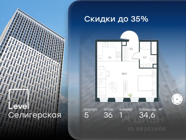 Цена указана с учётом скидки при 100%-й оплате, несубсидированной ипотеке, рассрочке (кроме программы "Рассрочка 0%"). В жилом квартале, расположенном в южной части района Западное Дегунино, продаётся 1-комнатная квартира площадью 48.30 кв.м без отделки. Квартира расположена на 18 этаже 40-этажного корпуса 5 в жилом комплексе комфорт-класса Level Селигерская (компания Level Group/Левел групп). Отличная транспортная доступность: - 10 мин. пешком до станции метро "Селигерская" от корпусов 1-й очереди; - 10 мин. пешком до станции метро "Верхние Лихоборы" от корпусов 2-й очереди; - 20 мин. пешком до станции МЦД-3 "Моссельмаш"; - 11 мин. на авто до МКАД; - 13 мин. на авто до ТТК; - 16 мин. на авто до Садового кольца. Расположение Район отличается богатой социальной инфраструктурой: школы, детские сады, поликлиники, магазины, фитнес-клубы, торговые центры - всё близко к дому. Рядом с Level Селигерская расположено 5 парковых зон. В 3 минутах от дома расположен перспективный сквер-парк. В 10 минутах пешком находится парк им. Святослава Фёдорова, в 13 минутах на велосипеде - парк "Ангарские пруды". В 7-11 минутах на автомобиле - два крупных природных объекта: Тимирязевский парк и Главный ботанический сад Российской академии наук. Благоустройство Внутренние дворы жилого комплекса огорожены от машин, а их функциональное наполнение отличается в зависимости от очереди строительства. На территории 1-й очереди будут: детская площадка, воркаут-зона, места для тихого отдыха и активных игр, а также сенсорный сад и большой луг. Во 2-й очереди жителей ждут уютные навесы с качелями, павильон-читальня, волейбольная площадка, беседки, а также детские и спортивные площадки. Технологии и инженерия Для входа на территорию комплекса предусмотрен единый ключ доступа. Все общественные зоны оснащены камерами видеонаблюдения, по заявке собственнику предоставляется возможность просмотра изображения отдельных видеокамер на его мобильном устройстве. При въезде в паркинг функционирует система распознавания госномеров. Кроме того, для комфорта жителей создано мобильное приложение, с помощью которого можно удаленно контролировать доступ на придомовую и жилую территории. Другие преимущества жилого комплекса - Высокая освещенность квартир: в большинстве из них не меньше трёх окон; - Супермаркет, магазины, кафе, пекарни и многое другое на первых этажах домов; - Частный детский сад; - Стильные дизайнерские лобби с высокими потолками до 4,9 м и окнами в пол, для питомцев предусмотрена лапомойка; - 20+ планировочных решений: от студий до семейных квартир; - С каждого этажа дома на лифте можно спуститься в подземный отапливаемый паркинг.
