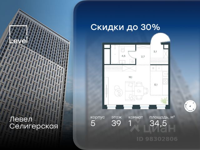 Цена указана с учётом скидки при 100%-й оплате, несубсидированной ипотеке, рассрочке (кроме программы "Рассрочка 0%"). В жилом квартале, расположенном в южной части района Западное Дегунино, продаётся 1-комнатная квартира площадью 29.50 кв.м без отделки. Квартира расположена на 2 этаже 40-этажного корпуса 5 в жилом комплексе комфорт-класса Левел Селигерская (компания Level Group/Левел групп). Отличная транспортная доступность: - 10 мин. пешком до станции метро "Верхние Лихоборы"; - 15 мин. пешком до станции метро "Селигерская"; - 20 мин. пешком до станции МЦД-3 "Моссельмаш"; - 11 мин. на авто до МКАД; - 13 мин. на авто до ТТК; - 16 мин. на авто до Садового кольца. Расположение Район отличается богатой социальной инфраструктурой: школы, детские сады, поликлиники, магазины, фитнес-клубы, торговые центры - всё близко к дому. Рядом с Левел Селигерская расположено 5 парковых зон. В 3 минутах от дома расположен перспективный сквер-парк. В 10 минутах пешком находится парк им. Святослава Фёдорова, в 13 минутах на велосипеде - парк "Ангарские пруды". В 7-11 минутах на автомобиле - два крупных природных объекта: Тимирязевский парк и Главный ботанический сад Российской академии наук. Благоустройство Внутренние дворы жилого комплекса огорожены от машин, а их функциональное наполнение отличается в зависимости от очереди строительства. На территории 2-й очереди жителей ждут уютные навесы с качелями, павильон-читальня, волейбольная площадка, беседки, а также детские и спортивные площадки. Технологии и инженерия Для входа на территорию комплекса предусмотрен единый ключ доступа. Все общественные зоны оснащены камерами видеонаблюдения, по заявке собственнику предоставляется возможность просмотра изображения отдельных видеокамер на его мобильном устройстве. При въезде в паркинг функционирует система распознавания госномеров. Кроме того, для комфорта жителей создано мобильное приложение, с помощью которого можно удаленно контролировать доступ на придомовую и жилую территории. Другие преимущества жилого комплекса - Высокая освещённость квартир: в большинстве из них не менее трёх окон; - Супермаркет, магазины, кафе, пекарни и многое другое на первых этажах домов; - Частный детский сад; - Стильные дизайнерские лобби с высокими потолками до 4,3 м. и окнами в пол, для питомцев предусмотрена лапомойка; - 30+ планировочных решений: от компактных студий до просторных семейных квартир; - С каждого этажа дома на лифте можно спуститься в подземный отапливаемый паркинг."