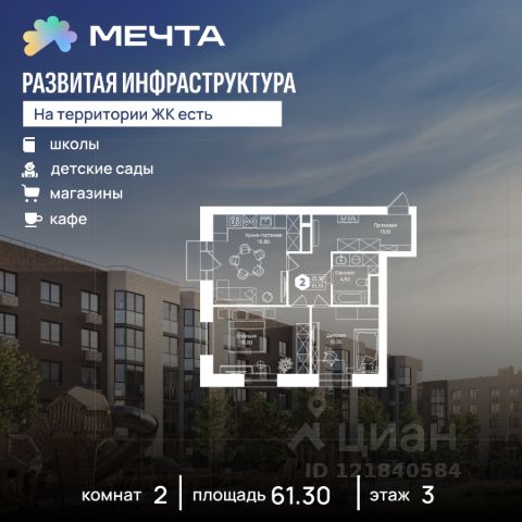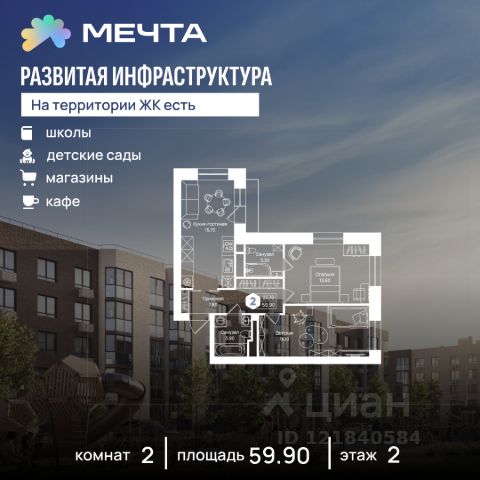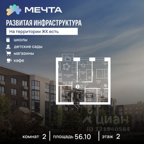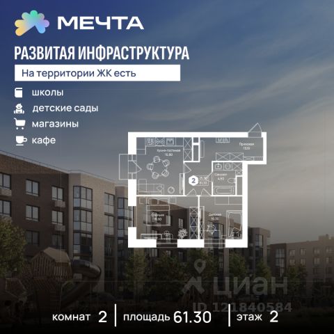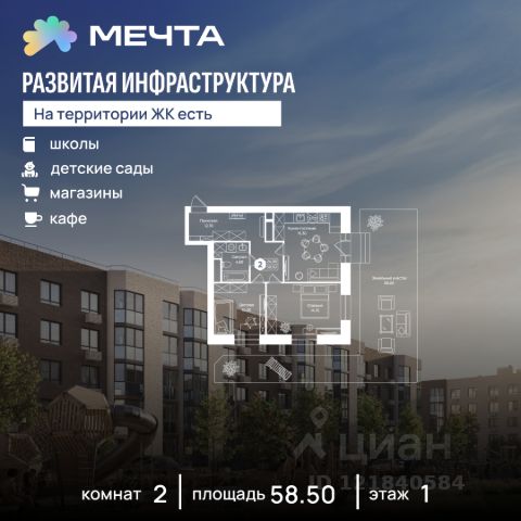 Рассрочка 0% от застройщика! Продается однокомнатная квартира в квартале "Любовь" жилого комплекса "Мечта". Общая площадь квартиры: 37.09 кв. м, этаж 2 из 5. Срок сдачи: 4 квартал 2027 г. Отделка: Чистовая ОСОБЕННОСТИ: - Просторная спальня - Гардеробная - Балкон - Высота потолка: 2.7 метра Квартал "Любовь" — это пять пятиэтажных домов, где продумано действительно всё. Здесь каждая квартира получает больше воздуха и света благодаря панорамным окнам и эркерам. А лифты в малоэтажном доме — большая редкость для Подмосковья, которая делает жизнь комфортнее с первого и до последнего этажа. Просторные мастер-спальни и продуманные планировки — визитная карточка квартала. А из 80% квартир открываются отличные виды: на зелёную зону, центральный парк, природный заказник или реликтовое озеро. В вашем дворе будет собственный детский сад, а в шаговой доступности — образовательный кампус, лес и Парк Мечты. Всё рядом, всё для жизни. Жилой комплекс "Мечта" расположен в 23 км от МКАД по Дмитровскому или Ленинградскому шоссе. ТРАНСПОРТНАЯ ДОСТУПНОСТЬ: - 15-20 минут на общественном транспорте до МЦД-1 "Лобня" - 30-35 минут на общественном транспорте до метро "Физтех" - 45-50 минут до станций метро "Савеловская" или "Белорусская" - 30 минут на автомобиле до Москвы Инфраструктура включает в себя муниципальную школу и детские сады, кабинет врача общей практики, множество кафе и ресторанов, а также различные спортивные и детские площадки. В пешей доступности от жилого комплекса расположены лес и три реликтовых озера — Долгое, Круглое и Нерское, а также реки Альба, Уча и Волгуша. Территория жилого комплекса закрыта для посторонних, находится под охраной и патрулируется. На въезде расположен КПП. Камеры видеонаблюдения работают круглосуточно на всей территории. Вы и ваши дети будете чувствовать себя в безопасности.