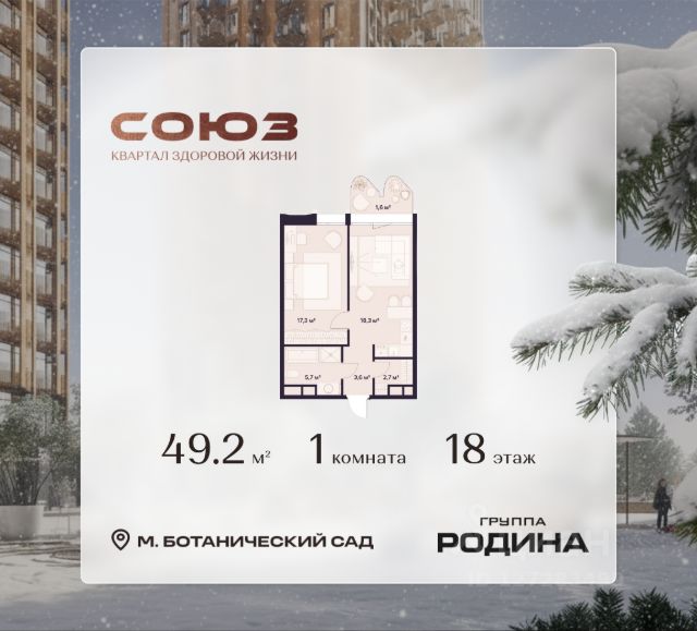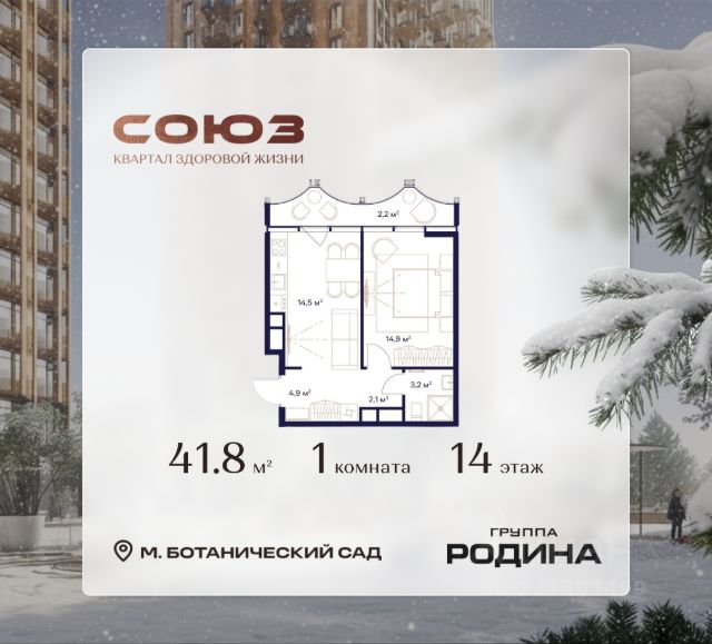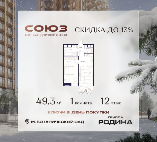 Рассрочка 0% Продаётся 1-комнатная квартира площадью 42.9 м² на 20 этаже в Жилом Комплексе "Союз". Квартал здоровой жизни премиум-класса с рекордным количеством олимпийских видов спорта: - Ледовая арена для хоккея и фигурного катания, - Футбольные поля для тренировок, - Спортивный зал для фехтования, - Бассейн на 6 дорожек, - Центр единоборств, - 4 крытых площадки для настольного тенниса, - 7 теннисных кортов (крытых и открытых), - 4 крытых площадки для сквоша, - Легкоатлетический стадион, - Площадки для баскетбола и волейбола. Уникальные форматы квартир с мастер-спальнями, приватными террасами, балконами, а также пентхаусы с открыточными видами на город. Все квартиры продаются с отделкой Shell&Core и панорамным остеклением. Расположение Пешком: - 2 мин. до парка "Сад Будущего"; - 6 мин. до ст. м. "Ботанический сад"; - 6 мин. до ст. МЦК "Ботанический сад"; - 6 мин. до парка "Леоновская роща"; На автомобиле: - 2 мин. до СВХ (МСД); - 5 мин. до Проспекта Мира; - 10 мин. до ТТК; - 15 мин. до Садового кольца; - 25 мин. до аэропорта "Шереметьево". Благоустройство - собственная спортивная инфраструктура 7 Га; - зона для пикников; - игровые и спортивные площадки для детей всех возрастов; - розарий, а также сосновые, каштановые и дубовые аллеи; - площадки под открытым небом для занятий спортом и йоги; - игровые комнаты для детей; - лаунж-зона для резидентов; - просторная переговорная для деловых встреч; - премиальный ресторан "Шабада" Сосо Павлиашвили с водными арт-объектами на прогулочной аллее, садом ароматных трав и сценой под открытым небом; - кафе, химчистки, аптеки и супермаркеты рядом с домом. Окружение - 8 парков: Сад Будущего, Леоновская роща, Хуамин, Главный ботанический сад РАН, Шереметьевская дубрава, Останкино, парк спорта "Яуза", пойма реки Яуза и музей-усадьба "Останкино"; - 3 ВУЗа: ВГИК, РГСУ, МГПУ; - 12 школ, в том числе: школа 1499 им. И.А. Докукина (топ 100), Brookes Moscow, IThub школа; - 18 детских садов, в том числе билингвальный ALERTUM KIDS; - один из крупнейших океанариумов Европы "Москвариум"; - один из крупнейших в Европе торгово-развлекательных центров "Европолис".