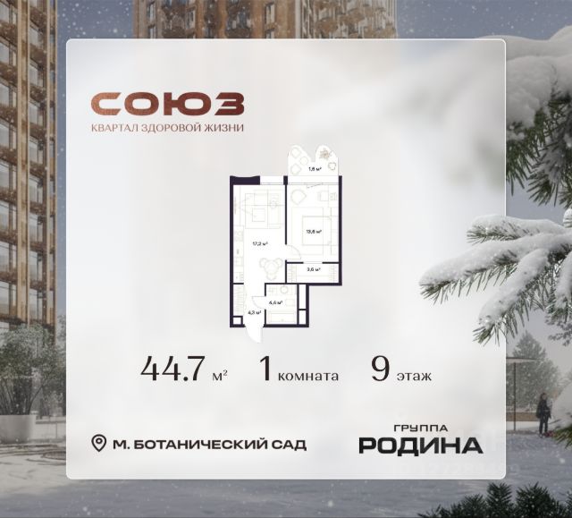 Рассрочка 0% Продаётся 1-комнатная квартира площадью 42.9 м² на 20 этаже в Жилом Комплексе "Союз". Квартал здоровой жизни премиум-класса с рекордным количеством олимпийских видов спорта: - Ледовая арена для хоккея и фигурного катания, - Футбольные поля для тренировок, - Спортивный зал для фехтования, - Бассейн на 6 дорожек, - Центр единоборств, - 4 крытых площадки для настольного тенниса, - 7 теннисных кортов (крытых и открытых), - 4 крытых площадки для сквоша, - Легкоатлетический стадион, - Площадки для баскетбола и волейбола. Уникальные форматы квартир с мастер-спальнями, приватными террасами, балконами, а также пентхаусы с открыточными видами на город. Все квартиры продаются с отделкой Shell&Core и панорамным остеклением. Расположение Пешком: - 2 мин. до парка "Сад Будущего"; - 6 мин. до ст. м. "Ботанический сад"; - 6 мин. до ст. МЦК "Ботанический сад"; - 6 мин. до парка "Леоновская роща"; На автомобиле: - 2 мин. до СВХ (МСД); - 5 мин. до Проспекта Мира; - 10 мин. до ТТК; - 15 мин. до Садового кольца; - 25 мин. до аэропорта "Шереметьево". Благоустройство - собственная спортивная инфраструктура 7 Га; - зона для пикников; - игровые и спортивные площадки для детей всех возрастов; - розарий, а также сосновые, каштановые и дубовые аллеи; - площадки под открытым небом для занятий спортом и йоги; - игровые комнаты для детей; - лаунж-зона для резидентов; - просторная переговорная для деловых встреч; - премиальный ресторан "Шабада" Сосо Павлиашвили с водными арт-объектами на прогулочной аллее, садом ароматных трав и сценой под открытым небом; - кафе, химчистки, аптеки и супермаркеты рядом с домом. Окружение - 8 парков: Сад Будущего, Леоновская роща, Хуамин, Главный ботанический сад РАН, Шереметьевская дубрава, Останкино, парк спорта "Яуза", пойма реки Яуза и музей-усадьба "Останкино"; - 3 ВУЗа: ВГИК, РГСУ, МГПУ; - 12 школ, в том числе: школа 1499 им. И.А. Докукина (топ 100), Brookes Moscow, IThub школа; - 18 детских садов, в том числе билингвальный ALERTUM KIDS; - один из крупнейших океанариумов Европы "Москвариум"; - один из крупнейших в Европе торгово-развлекательных центров "Европолис".