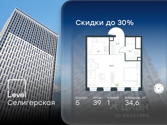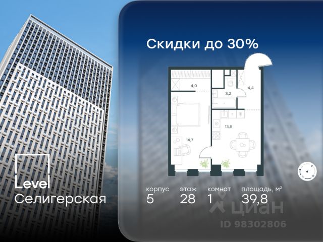 Цена указана с учётом скидки при 100%-й оплате, несубсидированной ипотеке, рассрочке (кроме программы "Рассрочка 0%"). В жилом квартале, расположенном в южной части района Западное Дегунино, продаётся 1-комнатная квартира площадью 41.20 кв.м без отделки. Квартира расположена на 5 этаже 40-этажного корпуса 3 в жилом комплексе комфорт-класса Level Селигерская (компания Level Group/Левел групп). Отличная транспортная доступность: - 10 мин. пешком до станции метро "Верхние Лихоборы"; - 15 мин. пешком до станции метро "Селигерская"; - 20 мин. пешком до станции МЦД-3 "Моссельмаш"; - 11 мин. на авто до МКАД; - 13 мин. на авто до ТТК; - 16 мин. на авто до Садового кольца. Расположение Район отличается богатой социальной инфраструктурой: школы, детские сады, поликлиники, магазины, фитнес-клубы, торговые центры - всё близко к дому. Рядом с Level Селигерская расположено 5 парковых зон. В 3 минутах от дома расположен перспективный сквер-парк. В 10 минутах пешком находится парк им. Святослава Фёдорова, в 13 минутах на велосипеде - парк "Ангарские пруды". В 7-11 минутах на автомобиле - два крупных природных объекта: Тимирязевский парк и Главный ботанический сад Российской академии наук. Благоустройство Внутренние дворы жилого комплекса огорожены от машин, а их функциональное наполнение отличается в зависимости от очереди строительства. На территории 2-й очереди жителей ждут уютные навесы с качелями, павильон-читальня, волейбольная площадка, беседки, а также детские и спортивные площадки. Технологии и инженерия Для входа на территорию комплекса предусмотрен единый ключ доступа. Все общественные зоны оснащены камерами видеонаблюдения, по заявке собственнику предоставляется возможность просмотра изображения отдельных видеокамер на его мобильном устройстве. При въезде в паркинг функционирует система распознавания госномеров. Кроме того, для комфорта жителей создано мобильное приложение, с помощью которого можно удаленно контролировать доступ на придомовую и жилую территории. Другие преимущества жилого комплекса - Высокая освещённость квартир: в большинстве из них не менее трёх окон; - Супермаркет, магазины, кафе, пекарни и многое другое на первых этажах домов; - Частный детский сад; - Стильные дизайнерские лобби с высокими потолками до 4,3 м. и окнами в пол, для питомцев предусмотрена лапомойка; - 30+ планировочных решений: от компактных студий до просторных семейных квартир; - С каждого этажа дома на лифте можно спуститься в подземный отапливаемый паркинг."
