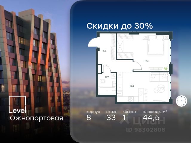 Цена указана с учётом скидки при 100%-й оплате, несубсидированной ипотеке, рассрочке (кроме программы "Рассрочка 0%"). В северной части района Печатники продается 1-комнатная квартира площадью 50.10 кв.м без отделки. Квартира расположена на 11 этаже 16-этажного корпуса 11 в жилом комплексе комфорт-класса Level Южнопортовая (компания Level Group/Левел групп). Отличная транспортная доступность: - 10 мин. пешком до станции метро "Кожуховская"; - 20 мин. пешком до станции МЦК "Дубровка"; - 3 мин. на авто до ТТК; - 13 мин. на авто до Садового кольца; - 15 мин. на авто до Бульварного кольца. Продуманный архитектурный проект: - авторская архитектура от бюро СПИЧ; - уникальные виды на реку, парки и достопримечательности города; - высота потолков в квартирах до 6 м; - окна высотой до 1,87 м с высоким коэффициентом сопротивления теплоотдаче. Расположение: Level Южнопортовая строится в северной части района Печатники - самой приближенной к центру. Здесь будет сформирован новый район "Южный порт", где построят крупный жилой и общественно-деловой центр, аналогичный Москва-Сити. В течение 10-12 лет в этом месте появятся не только жилые дома, но и развитая инфраструктура для жизни и работы. А еще совсем рядом находится набережная Москвы-реки, где планируется построить причалы для речных трамвайчиков и канатную дорогу. Уже сейчас вокруг жилого комплекса работают десятки магазинов и торговых центров, рядом расположено 6 парков, среди которых музей-заповедник "Коломенское". В 10 минутах пешком - 2 муниципальных и 2 частных детских сада, 7 общеобразовательных школ. Внутренняя инфраструктура: Для отдыха жителей в каждом корпусе предусмотрено лобби, оснащенное местами для отдыха, гостевыми санузлами и лапомойками, а в отдельных корпусах - камином. За счёт больших окон и высоких потолков пространства будут наполнены воздухом и светом. На первых этажах жилого комплекса откроются магазины, салоны красоты, фитнес-центр. Для детей строятся собственные детский сад и школа. Благоустройство: Внутренний двор комплекса разработан совместно с бюро GAFA. Основная идея - создать аналог Центрального парка в Нью-Йорке, гармонично сочетая высотные здания и большое изолированное парковое пространство. Вся площадь двора-парка будет огорожена и составит более 2 га, из которых 45% - озеленение. Одним из самых важных ландшафтных элементов здесь станет небольшая речка, наполняющаяся во время дождя. Вокруг неё появится сеть из островов, внутри которых расположатся тематические зоны спорта и отдыха. Технологии и инженерия: - автоматическая передача в управляющую компанию показаний квартирных счётчиков; - телефонная связь, телевидение и интернет на базе оптической мультисервисной сети; - гостевой Wi-Fi в лобби и на территории двора; - единый ключ доступа для входа на территорию комплекса.