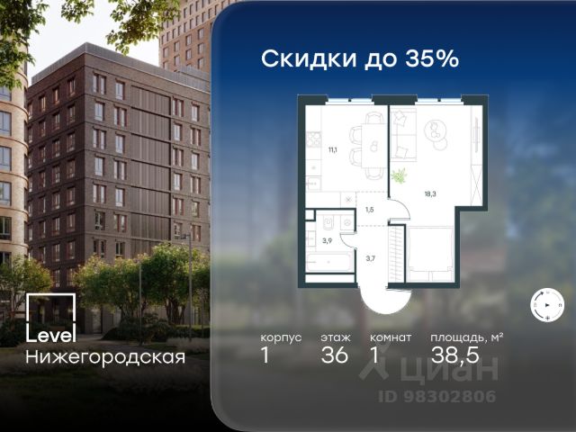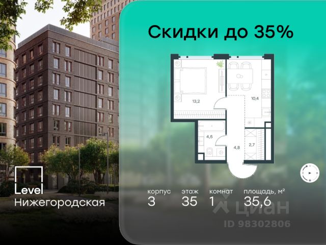 Цена указана с учётом скидки при 100%-й оплате, несубсидированной ипотеке, рассрочке (кроме программы "Рассрочка 0%"). В активно развивающемся районе на юго-востоке столицы продается 1-комнатная квартира площадью 35,6 кв.м без отделки.. Квартира расположена на 37 этаже 37-этажного этажного корпуса 3 в жилом комплексе комфорт-класса Level Нижегородская (компания Level Group/Левел групп). Отличная транспортная доступность - 10 мин. пешком до станции метро, МЦД-4, БКЛ и МЦК "Нижегородская"; - 13 мин. пешком до станций метро "Андроновка" и "Перово"; - 10 мин. на авто до ТТК; - 14 мин. на авто до Садового кольца. Благоустройство Благоустроенная территория комплекса делится на внешнюю и внутреннюю. Внутренняя часть - это закрытый двор 0,9 га, где обустраиваются детские площадки для разных возрастных групп, беседки для отдыха и работы, несколько спортивных зон, включая воркаут-зоны и лужайку для бадминтона. Здесь же появится ухоженный луг с прогулочными маршрутами. Рядом с жилым комплексом будет создан ландшафтный парк площадью 2,4 га. В парке будут высажены высокие деревья, луговые травы и кустарники, благоустроены лаунж-зоны у пруда, дорожки для бега и прогулок. В центре парка предусмотрена событийная площадь, рядом расположатся дополнительные спортивные и детские площадки, а также зона для выгула домашних питомцев. Внутренняя инфраструктура Дома жилого комплекса будут оснащены коммерческими помещениями, где откроются все необходимые сервисы: магазины, аптеки, салоны красоты, кофейни, службы доставки и многое другое. Комфорт - это когда всё рядом. Кроме того, на территории Level Нижегородская предусмотрен подземный отапливаемый паркинг. Этап 1 включает 335 машино-мест и 143 кладовых помещения для хранения сезонных вещей. Технологии и безопасность На территории всех общественных зон постоянно ведется видеонаблюдение и предусмотрен высокоскоростной Wi-Fi. Подъезды, паркинг и внутренний двор оснащены системой контроля доступа. Для удобства жителей создано мобильное приложение, позволяющее связаться с управляющей компанией, осуществлять удаленное управление видеодомофоном или просмотреть изображение отдельных видеокамер по заявке. Для безопасного перемещения по этажам и комфортного спуска в паркинг будут установлены современные лифты от компании BLT Brilliant Elevator. Скорость лифтов - 1,6 - 2,5 м/с. Особенности - Архитектура от экспертов из бюро ARCH(E)TYPE; - Разноуровневая застройка - от секций средней этажности до высоток в 45 этажей (этап 1); - Окна шириной до 2,2 метров (этап1) с видами на Останкинскую башню, Измайловский парк, "Москва-Сити" и Кусковский лесопарк; - Лобби с окнами в пол и потолками от 3,4 метров, оснащенные консьерж-сервисом; - Более 35 видов планировок, включая редкие форматы. Артикул 3-422.