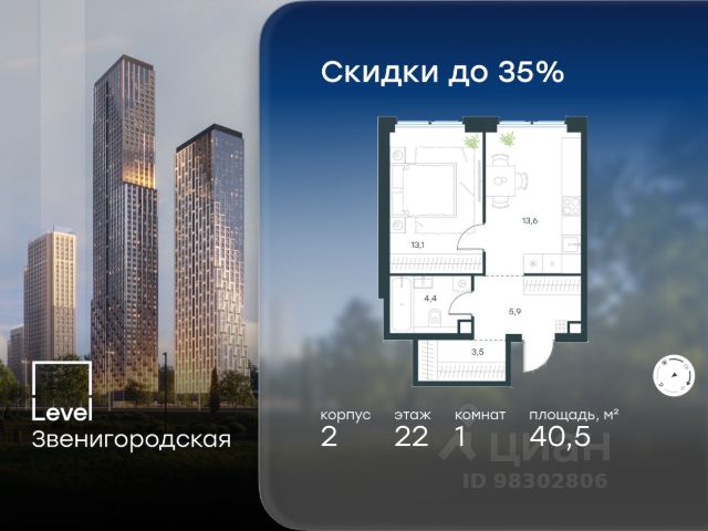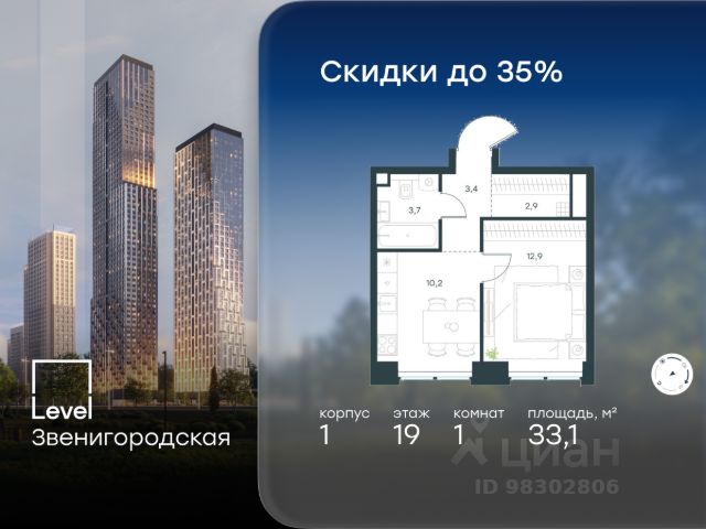 Цена указана с учётом скидки при 100%-й оплате, несубсидированной ипотеке, рассрочке (кроме программы "Рассрочка 0%"). В жилом квартале продаётся 1-комнатная квартира площадью 32.50 кв.м без отделки. Квартира расположена на 19 этаже 64 этажного корпуса 2 в жилом комплексе комфорт класса Level Звенигородская (компания Level Group/Левел групп). Отличная транспортная доступность - 5 мин. пешком до метро "Звенигородская" (откроется к окончанию строительства); - 18 мин. пешком до станции МЦК "Хорошёво" и станции БКЛ "Народное ополчение"; - 4 мин. на авто до ТТК; - 8 мин. на авто до Садового кольца; - 15 мин. на авто до Кремля. Продуманный архитектурный проект - Концепция от студии Станислава Михаловского, в основу которой легло единение природы и города; - Двухкамерные стеклопакеты в окнах, алюминиевый и ПВХ профиль - в квартирах тепло зимой и прохладно летом; - С верхних этажей откроются панорамные виды на город, Москву-реку, "Москва-Сити" и Москворецкий парк; - Лобби со всеми удобствами: окна в пол, высокие потолки до 4,7 м, лаунж-зоны, колясочные, гостевые санузлы и мойки для лап животных; - Централизованные водонагреватели гарантируют круглогодичную подачу горячей воды в каждую квартиру. Благоустройство Концепция благоустройства разработана совместно с бюро UNK landscape. Высота башен приближается к 200 метрам - они словно касаются неба. Небесный простор проецируется на территорию двора с помощью подсветки, визуально увеличивая пространство и отражаясь в авторских элементах архитектуры. На территории площадью 0,45 га расположатся: - "Облако событий" - место встреч и общения; - "Облако спорта" - всё для поддержания себя в форме; - "Облако принятия решений" - пространство для работы на свежем воздухе; - "Облако спокойствия" - для отдыха в тишине природы; - "Облако игр" - площадки для подростков и самых маленьких. Инфраструктура В жилом комплексе откроется 21 коммерческое помещение: продуктовые лавки, кафе, салоны красоты, службы доставки и творческие студии. Этап 1 включает строительство двухуровневого подземного паркинга. Всего здесь расположится 351 машино-место, включая семейные места, и 264 кладовых помещения. В распоряжении жителей развитая инфраструктура района: 15 супермаркетов, 5 спортивных объектов, 9 медучреждений, 7 детских садов, 4 школы, 3 благоустроенных парка - всё в шаговой доступности. Инженерия Комфортное перемещение внутри домов будут обеспечивать надёжные лифты с доступом в паркинг с жилых этажей. В каждом корпусе предусмотрено до шести кабин, включая сервисные лифты. Попасть на территорию комплекса можно только по единому ключу доступа. Видеонаблюдение установлено на входах в подъезды, в лобби, в общих зонах, на въезде в паркинг. Гости смогут связаться с жителями дома через входные видеопанели, а управлять доступом на территорию можно через видеодомофон или приложение на телефоне.