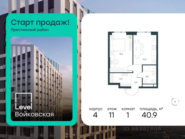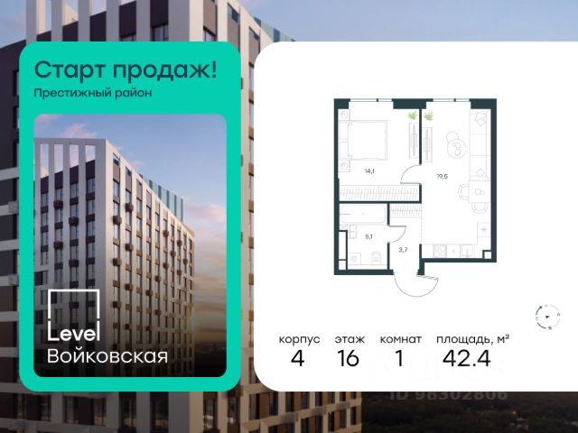 Цена указана с учётом скидки при 100%-й оплате, несубсидированной ипотеке, рассрочке (кроме программы "Рассрочка 0%"). Продается 1-комнатная квартира площадью 42.10 кв. м без отделки. Квартира находится на 5 этаже 20-этажного корпуса 5, в новом жилом комплексе бизнес-класса Level Войковская, расположенном рядом с живописным заповедником "Покровское-Стрешнево" (застройщик - компания Level Group/Левел групп). Прекрасная транспортная доступность - 7 мин. пешком до станции МЦК "Балтийская"; - 15 мин. пешком до станции метро "Войковская"; - 8 мин. на машине до ТТК; - 15 мин. на машине до центра Москвы; - 20 мин. на машине до Москва-Сити. Продуманный архитектурный проект - стильная архитектура от мастерской Фефелова В. В.; - панорамные виды на парки, Химкинское водохранилище и Останкинскую башню; - лобби с высотой потолков до 6,45 метров; - более 20 видов планировочных решений, включая редкие форматы квартир с террасой и увеличенной высотой потолков до 5,42 метров; - 2 варианта дизайнерской отделки в корпусе 4, предлагаются как дополнительная опция к отделке white box: стиль Modern в светлых холодных тонах и стиль Classic в нейтральной бежевой гамме. Квартиры в корпусах 3 и 5 сдаются без отделки. Расположение Level Войковская строится в престижном Северном округе Москвы. Развитая инфраструктура и живописная природа переплетаются в единый ансамбль, столь значимый для комфортной жизни. Войковский район окружают парки и набережные. В шаговой доступности - парк "Покровское-Стрешнево", не более 15-ти минут на велосипеде занимает путь до Тимирязевского парка и 9-ти минут до парка усадьбы Михалково. Рядом более 60 школ, 75 дошкольных учреждений, 17 государственных и 6 частных вузов, 25 супермаркетов, 4 торговых центра, среди которых ТЦ "Метрополис" и ТЦ "Авиапарк". Внутренняя инфраструктура На территории жилого комплекса предусмотрены коммерческие помещения: кафе, ресторан, пекарня и другие сервисы откроются на первых этажах корпусов. Для жителей будет доступен отапливаемый подземный паркинг на 244 машино-места с доступом с любого этажа на лифте. На территории паркинга будет расположено 125 кладовых помещений для хранения сезонного инвентаря. Лобби и благоустройство Дизайн лобби Level Войковская создан совместно с бюро BLANK. Это уютные гостиные, где хочется задержаться. Теплая цветовая гамма, ресепшен, зоны ожидания, лапомойки и гостевые санузлы - каждая деталь превращает лобби в комфортное продолжение вашего дома. 1,15 га площади в первых двух этапах строительства отведено под приватный внутренний двор, который спроектирован совместно с бюро "Правда". Детские площадки для всех возрастов, спортивные пространства для йоги, воркаута и петанка, уютные зоны для тихого отдыха или работы. Здесь утро начинается с вдохновения, а вечер наполнен приятными моментами. Лифты Комфортное перемещение внутри жилого комплекса будут обеспечивать надёжные лифты с доступом в паркинг с жилых этажей. В каждом корпусе предусмотрено по 3 грузопассажирских лифта.