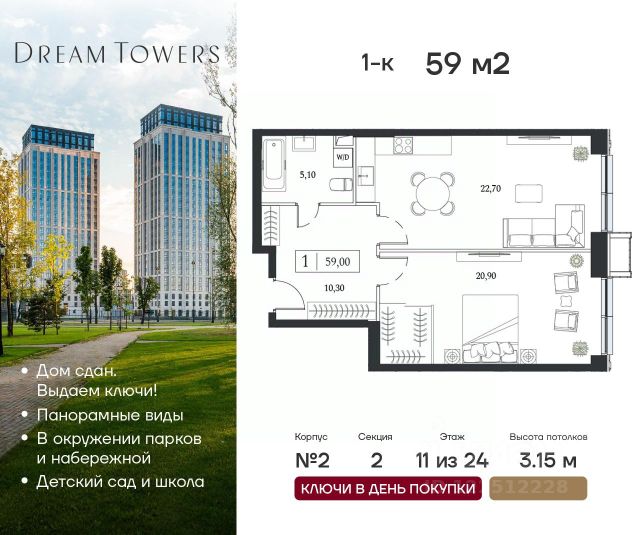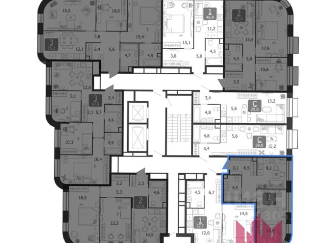 Среди планировочных решений представлены разнообразные форматы: от функциональных студий до просторных 4-комнатных квартир и апартаментов площадью от 22 до 105 м². Высокие потолки усиливают ощущение простора, а продуманные планировки включают мастер-спальни, гардеробные, угловые окна, объединённые кухни-гостиные и несколько санузлов.