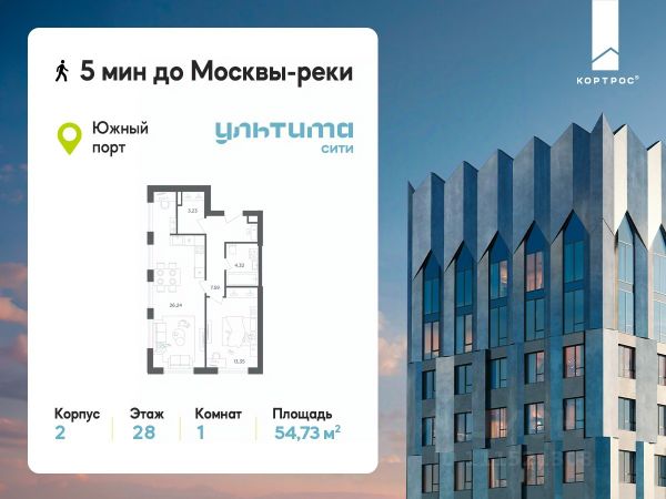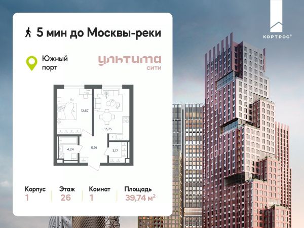 Предложение месяца от застройщика: - Скидка до 10% на ограниченный пул квартир - Рассрочка 0% на 1 год - Семейная ипотека без удорожания, ставка 4% - Ипотека для всех на весь срок, ставка 11,89% Продаётся 1-комнатная квартира от застройщика ГК "КОРТРОС" в жилом комплексе бизнес-класса УЛЬТИМА Сити. Квартира расположена на 26 этаже 45 этажного корпуса 1. Общая площадь 39,74 м². Без отделки. УЛЬТИМА Сити — жилой комплекс бизнес-класса в перспективном районе на юго-востоке Москвы. На его территории появятся 9 башен на 756 этажей, двухуровневый подземный паркинг, собственная инфраструктура, включая детский сад и школу. Всего девелопер благоустроит территорию в 2,6 га. Ближайшая станция метро — "Южный порт". Она откроется в 2028 году и будет находиться в 2-х минутах ходьбы. А прямо напротив расположится остановка водного автобуса-электрохода "Синичка". Дорога от квартала будет удобна и для автомобилистов: - до Кремля — 12 км - до МКАД — 12 км - до выезда на ТТК — 3 км - до Садового кольца — 8 км В двух корпусах первой очереди УЛЬТИМА Сити этажностью 45 и 52 реализуется 1 079 квартир с продуманными, рациональными планировочными решениями. В ассортиментной линейке представлены однокомнатные квартиры от 28,2 до 61 кв. м, двухкомнатные лоты от 44,3 до 95,4 кв. м, квартиры с тремя (71 — 115,57 кв. м) и четырьмя спальнями (106,6 — 114,97 кв. м). В экспозиции также есть квартиры с террасами, лоджиями, тремя и четырьмя санузлами, а также с функциональными нишами-кладовыми на кухнях. Запроектированы и эксклюзивные двухуровневые резиденции со вторым светом, в том числе с видом на Москву-реку, площадью от 77,7 до 141,9 кв. м. В рамках проекта запланировано строительство 9 корпусов, школы на 500 учащихся и детского сада на 225 мест. Еще будет создана продуманная инфраструктура для жителей: детские и спортивные площадки, амфитеатр для мероприятий, беседки и теплицы для садоводства, коворкинг, детский клуб и ресторан с открытой террасой. Доступ в жилой комплекс осуществляется по биометрическому контролю. Вокруг квартала будет приватная территория с видеонаблюдением и консьерж-сервисом 24/7. Лобби корпусов будут иметь двойные выходы: на улицу и во внутренний закрытый двор.
