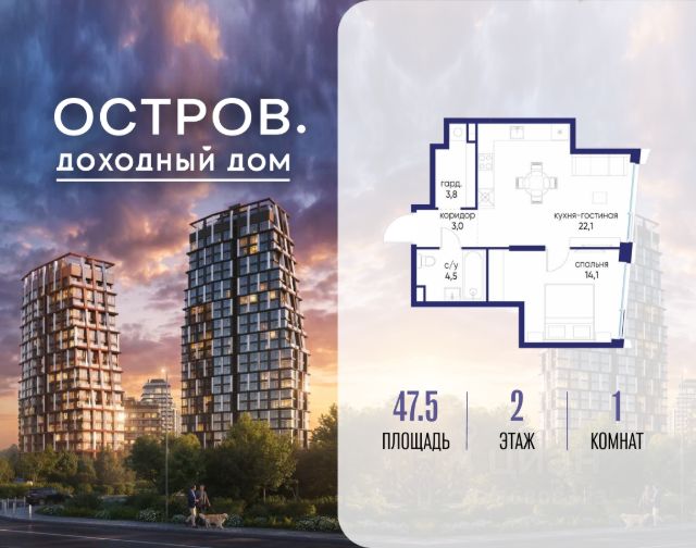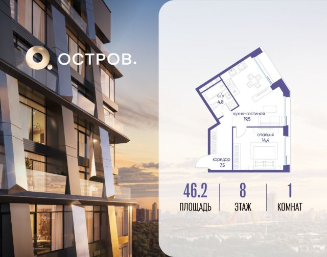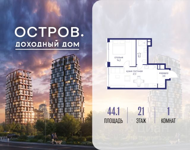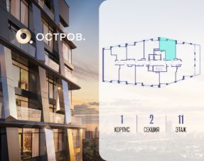 Остров1, общей площадью 42,8 кв. м, расположена в 5 корпусе на 11 этаже.